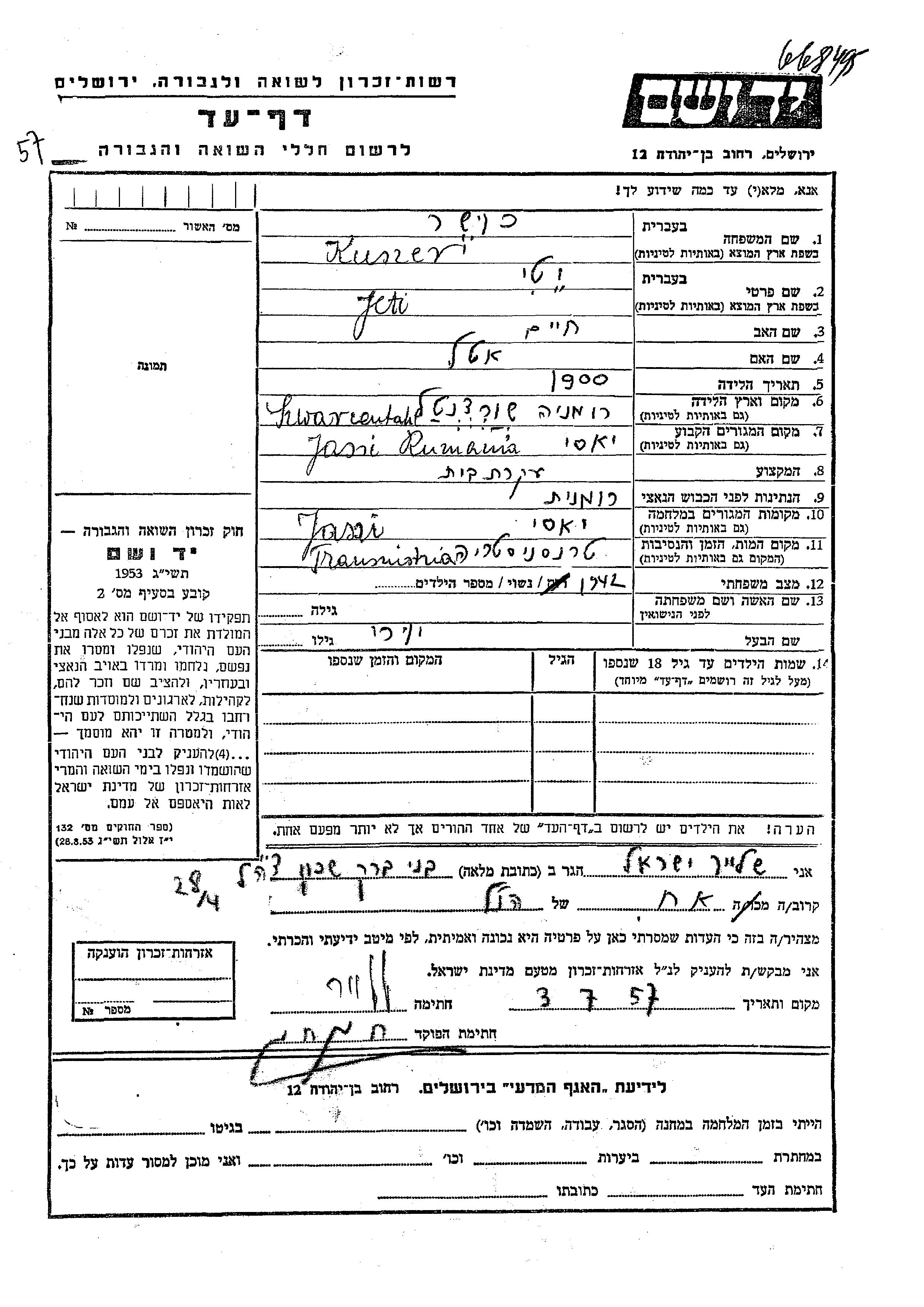 Yeti Kuszer wurde im Jahr 1900 geboren. Sie war die Tochter von Khaim und Etel. Sie war Hausfrau und mit Yuri Verheiratet. Vor dem Zweiten Weltkrieg lebte sie in Iasi, Rumänien. Während des Krieges war sie in Iasi, Rumänien.