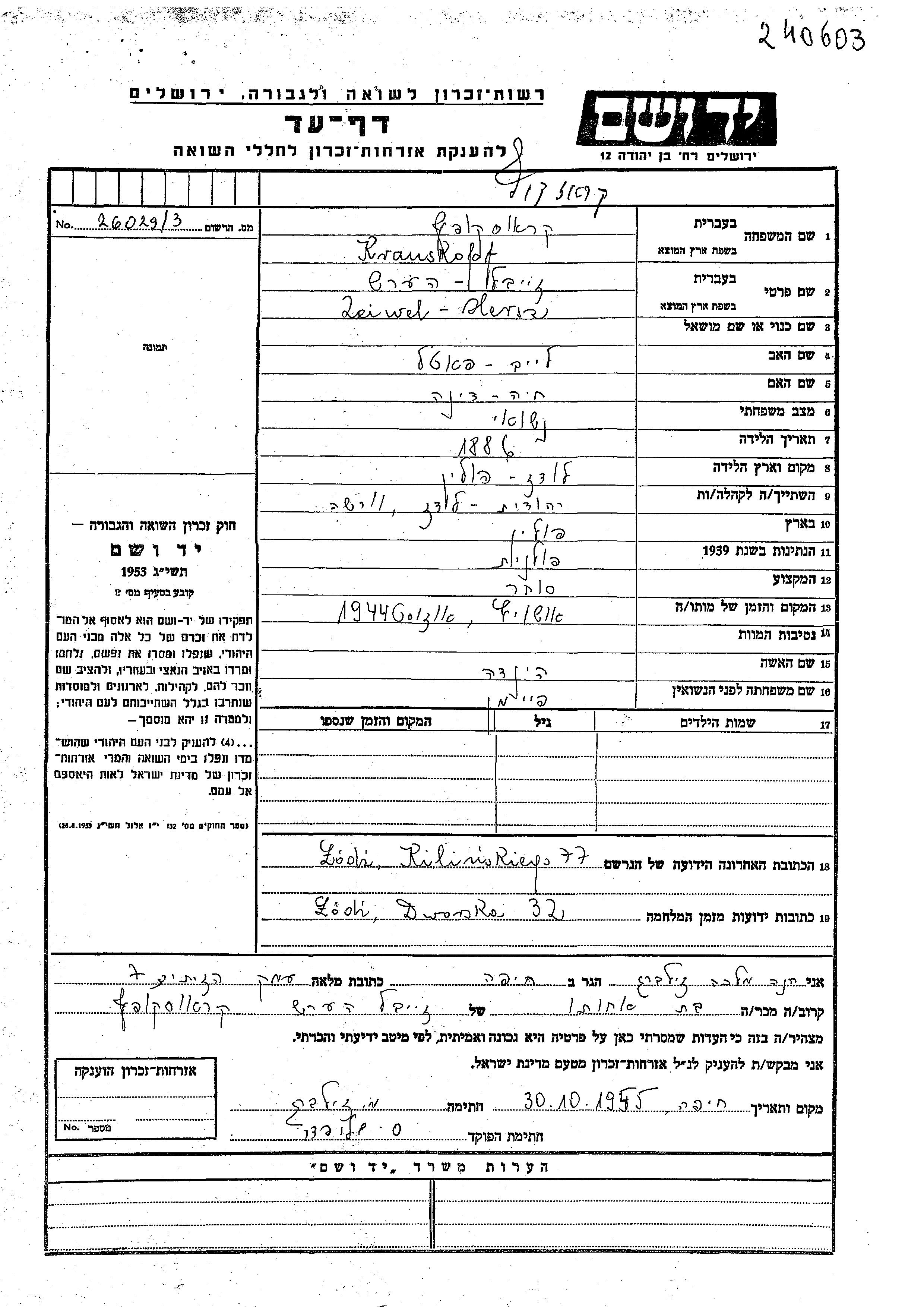 Seiwel Hersz Krauskopf wurde im Jahr 1886 in Lodz, Polen geboren. Er war der Sohn von Leib Fatel und Khaia Dina. Er war Kaufmann/-frau und mit Hinda, geb. Feiman Verheiratet. Vor dem Zweiten Weltkrieg lebte er in Warsaw, Polen. Während des Krieges war er in Lodz, Polen.