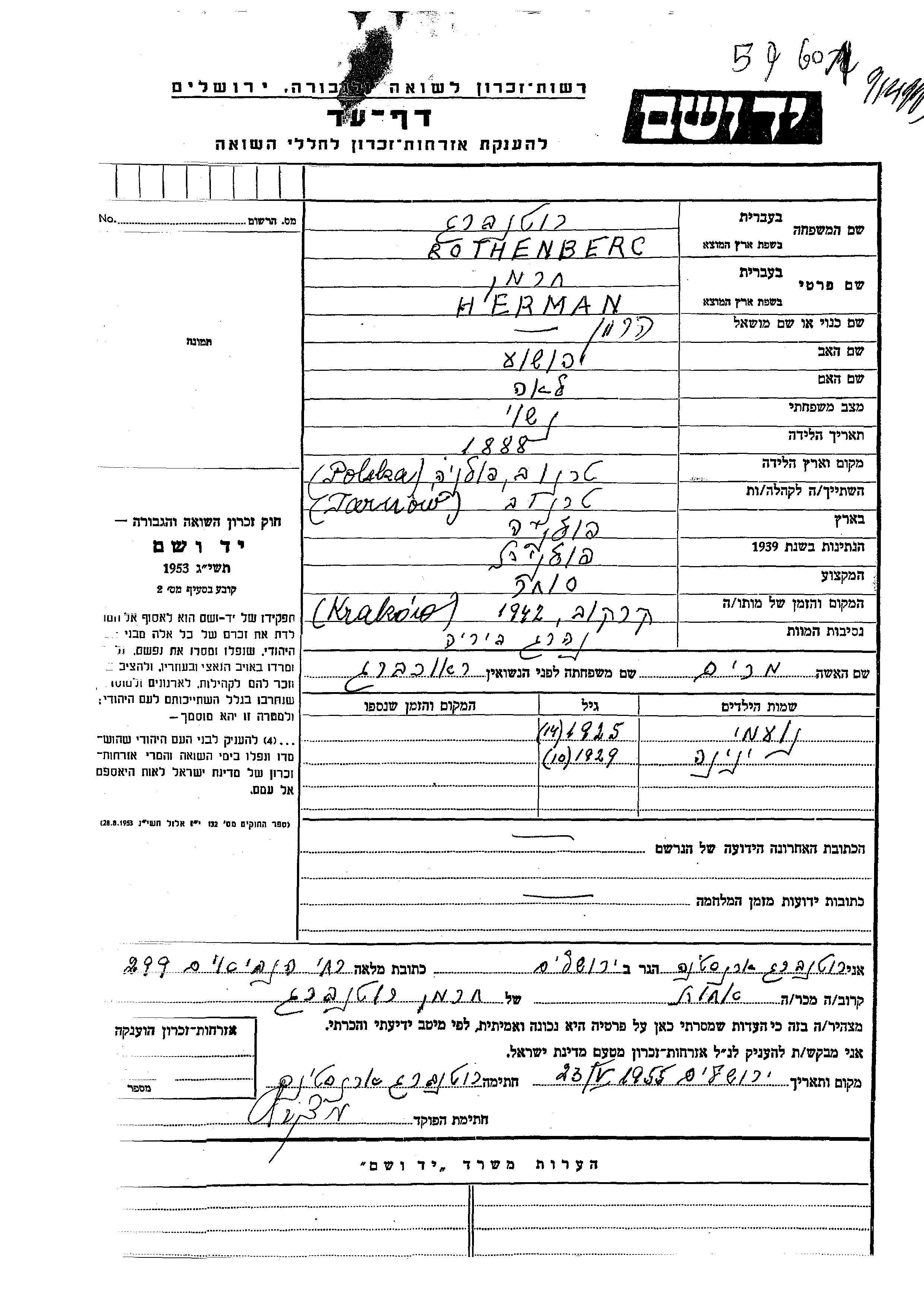 Herman Rothenberg wurde im Jahr 1888 in Tarnow, Polen geboren. Er war der Sohn von Yehoshua und Lea. Er war Kaufmann/-frau und mit Miriam, geb. Rauchberg Verheiratet. Vor dem Zweiten Weltkrieg lebte er in Tarnow, Polen.