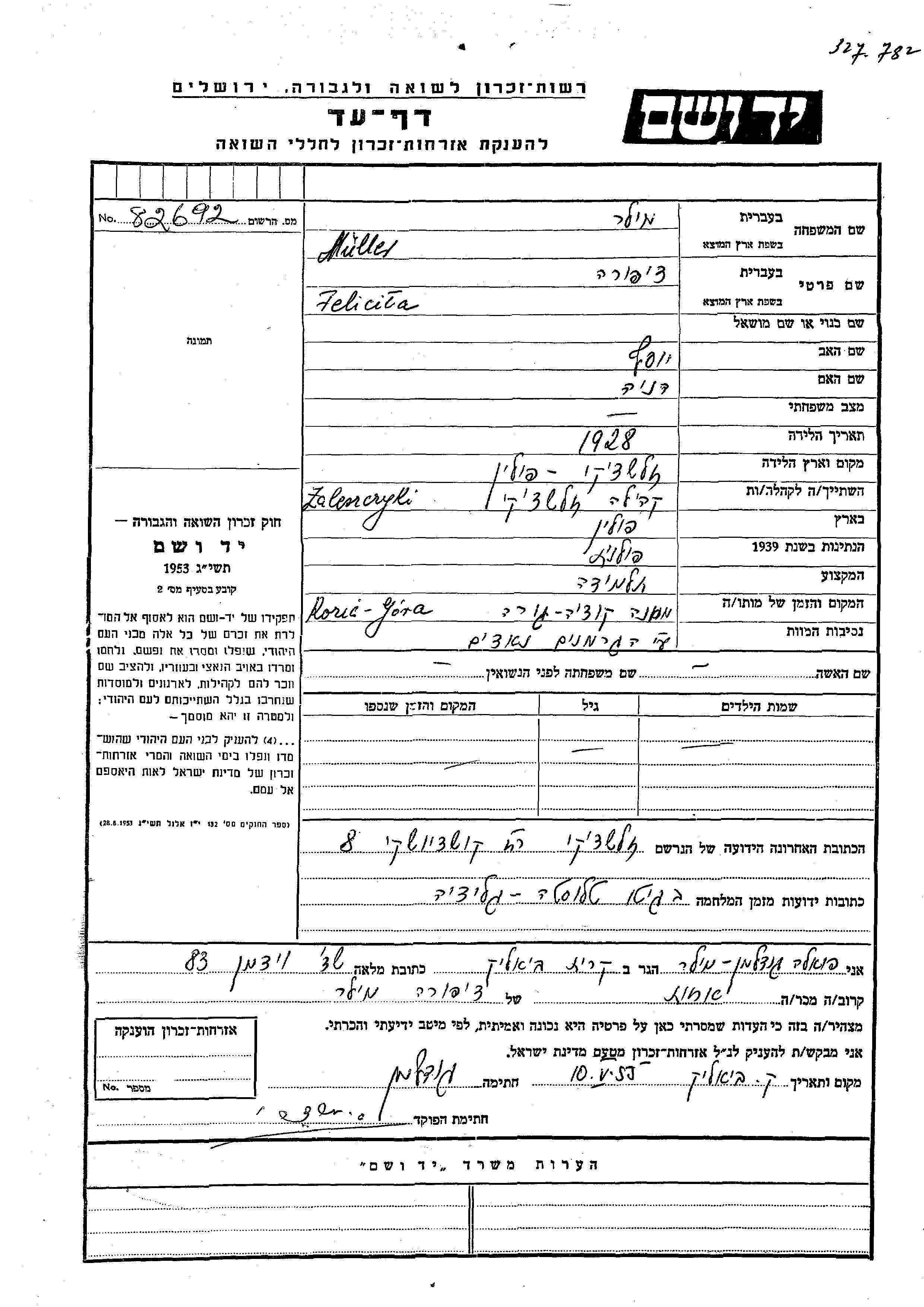 Felicita Tzipora Miller wurde im Jahr 1928 in Zaleszczyki, Polen geboren. Sie war die Tochter von Yosef und Dania. Sie war Schüler/-in. Vor dem Zweiten Weltkrieg lebte sie in Zaleszczyki, Polen. Während des Krieges war sie in Tluste, Polen.