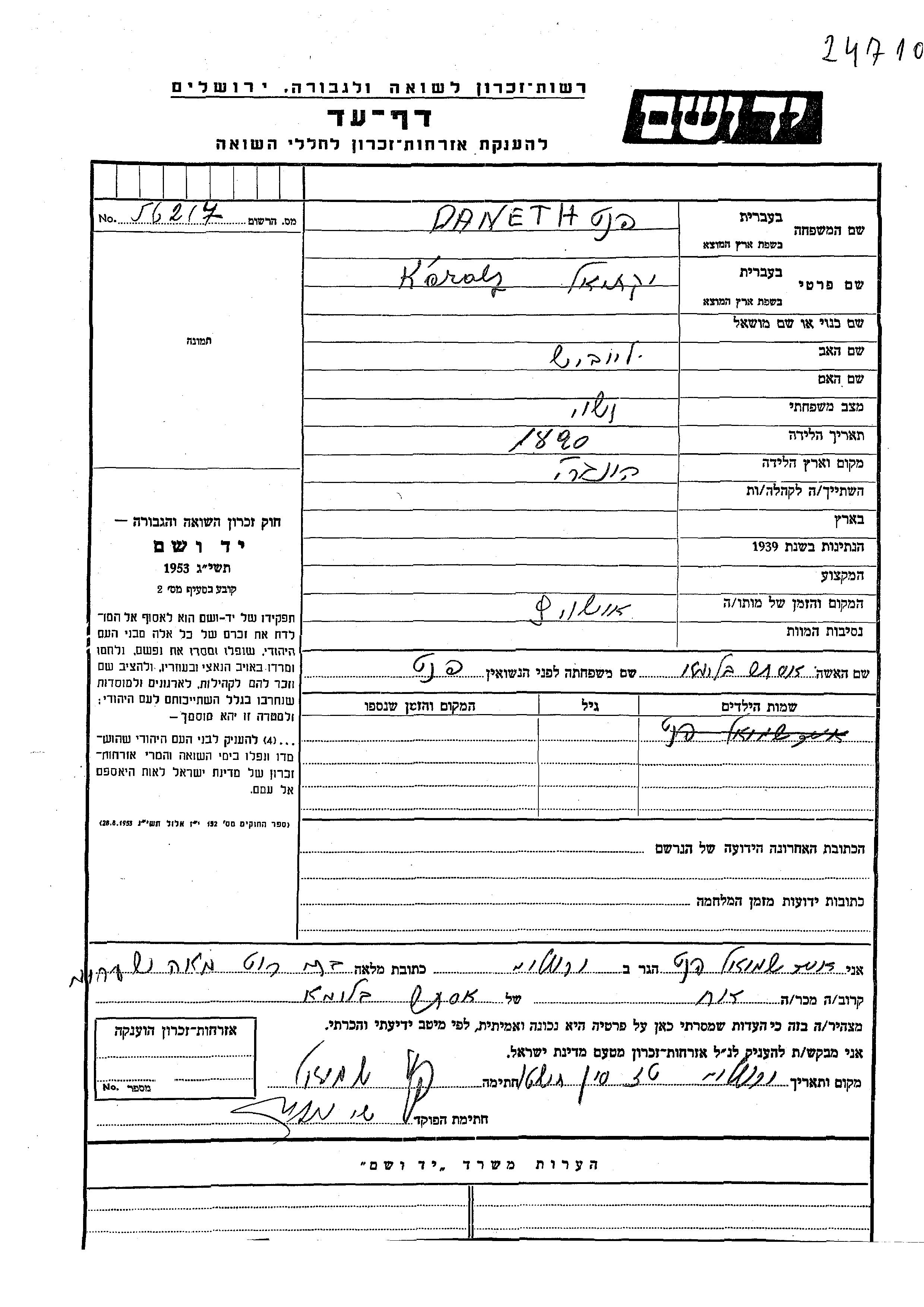 Karoly Yekutiel wurde in der Schoah ermordet. Todesort: Auschwitz, Polen.