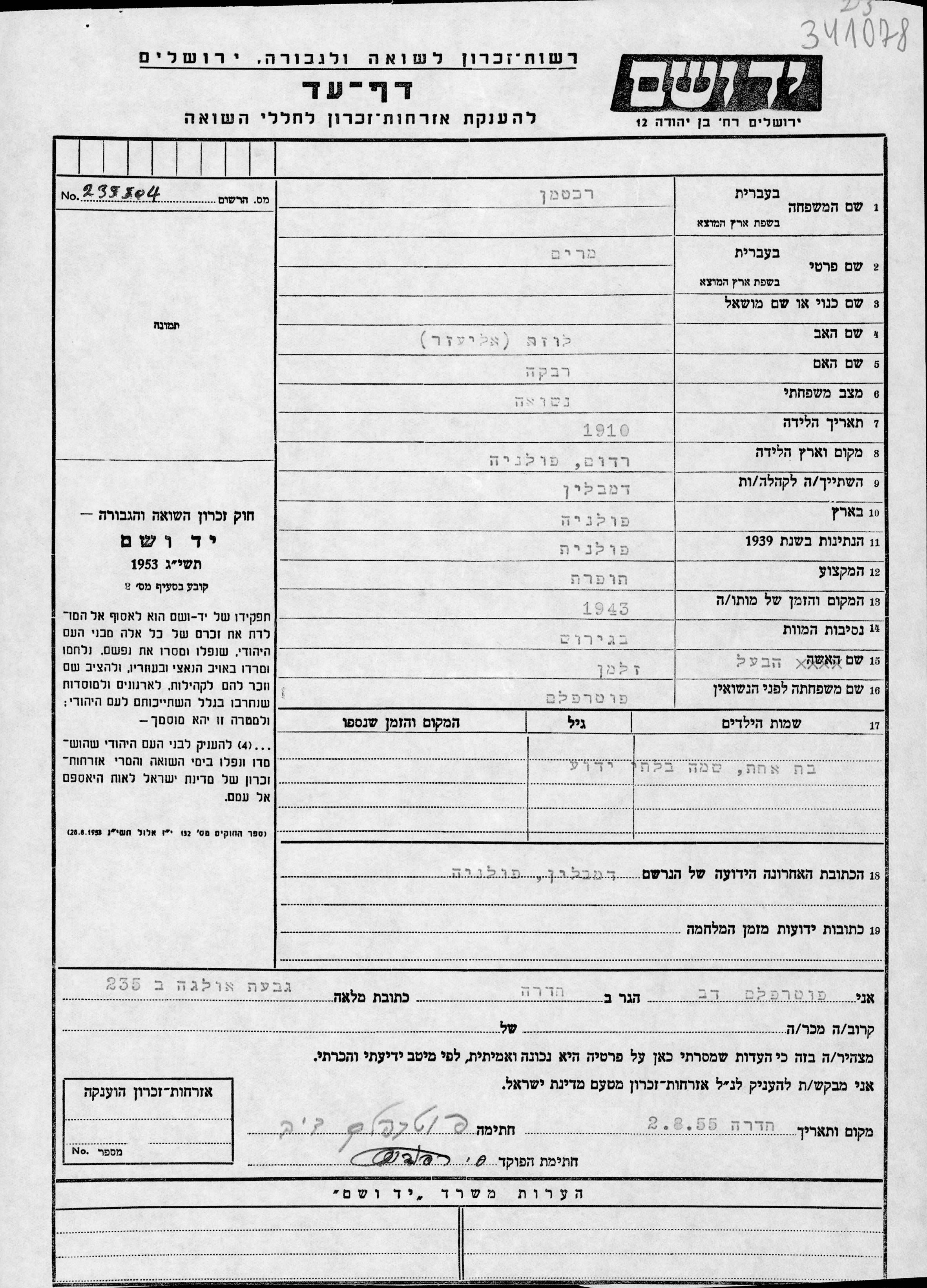 Rekhtman Miriam 1910 Demblin, Polen Gedenkblatt