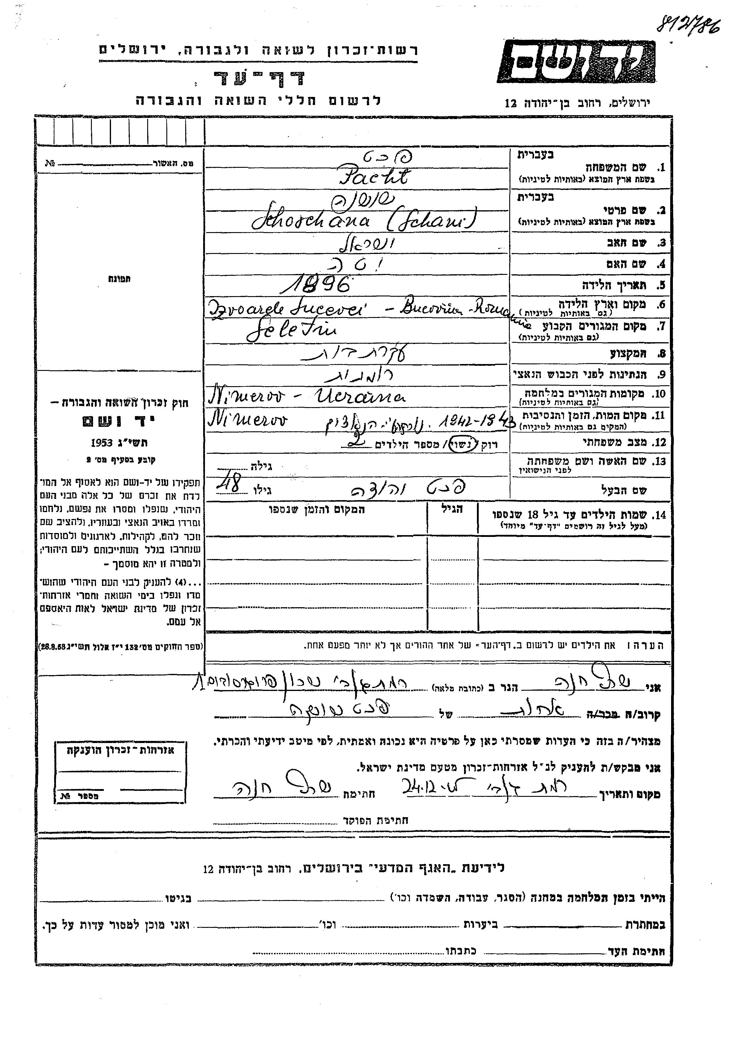 Schoschana Schani Pacht wurde im Jahr 1896 geboren. Sie war die Tochter von Yisrael und Yeta. Sie war Hausfrau und mit Yehuda Verheiratet. Vor dem Zweiten Weltkrieg lebte sie in Seletin, Rumänien. Während des Krieges war sie in Niemirow, Polen.