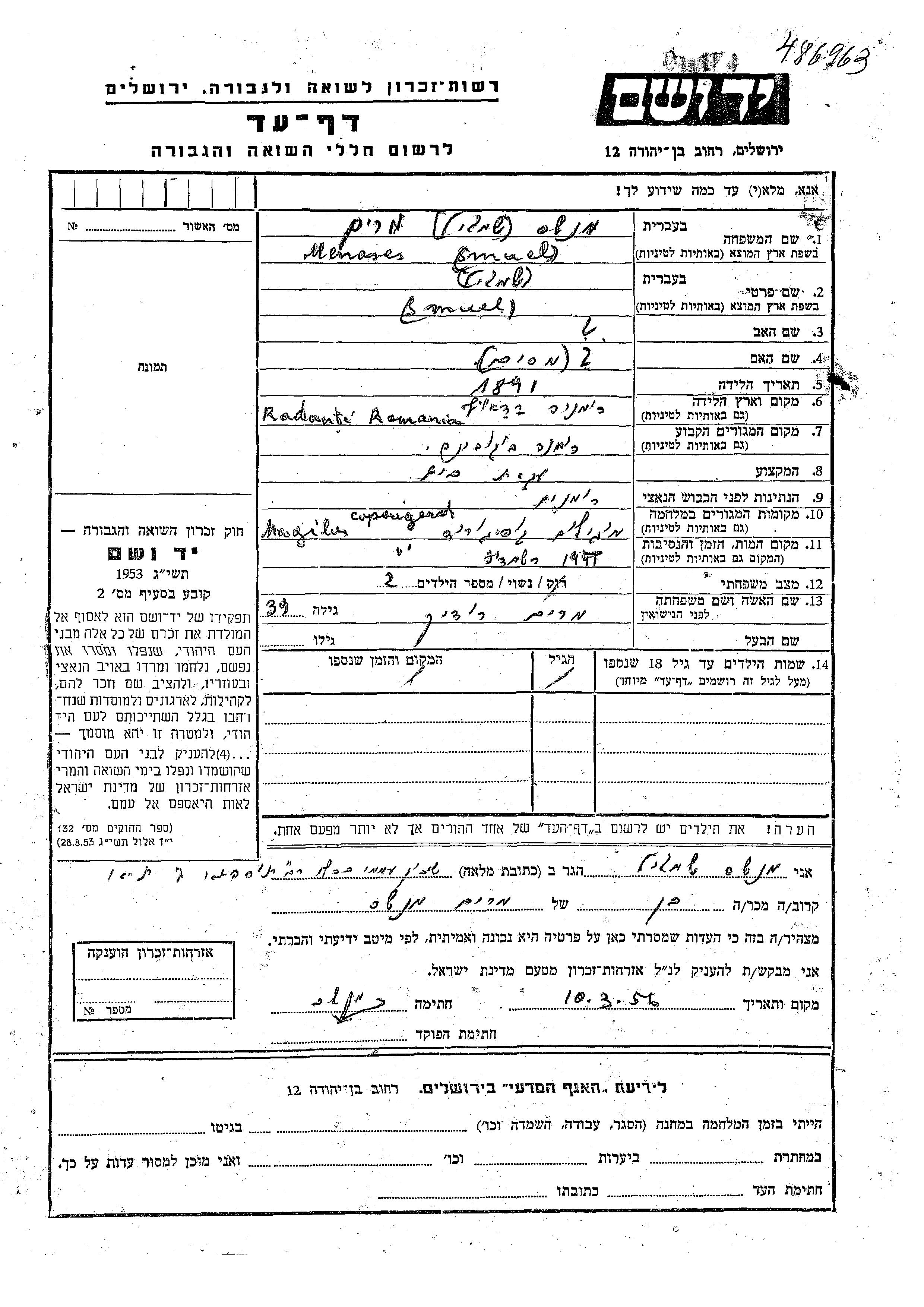 Miriam Menases Smuel, geb. Rodik wurde im Jahr 1891 geboren. Sie war die Tochter von Meirim. Sie war Hausfrau und Verheiratet. Während des Krieges war sie in Mogelov, Ukraine (UdSSR).