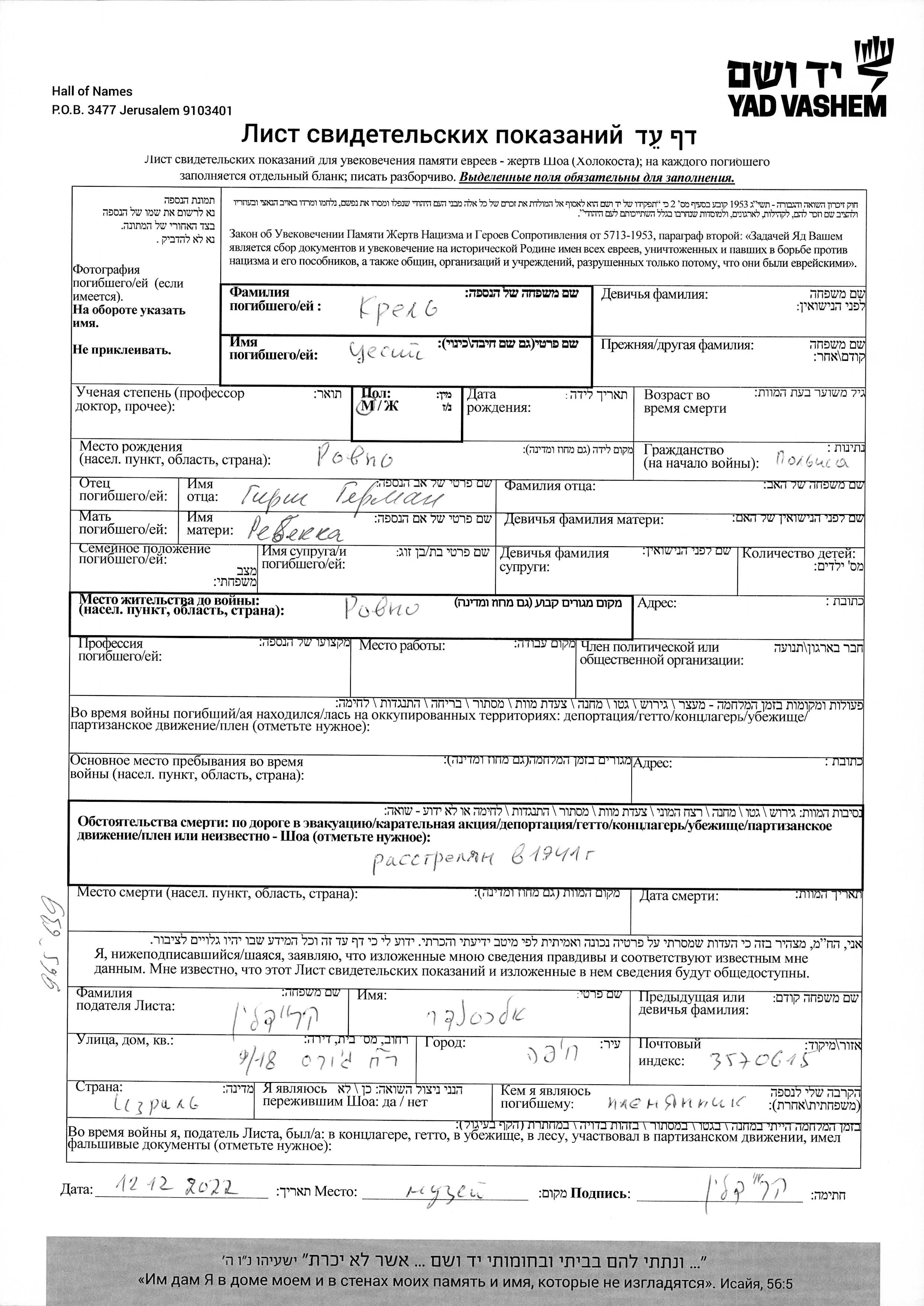 Tzesi wurde in der Schoah ermordet. Todesort: Rowno, Polen im Jahr 1941.