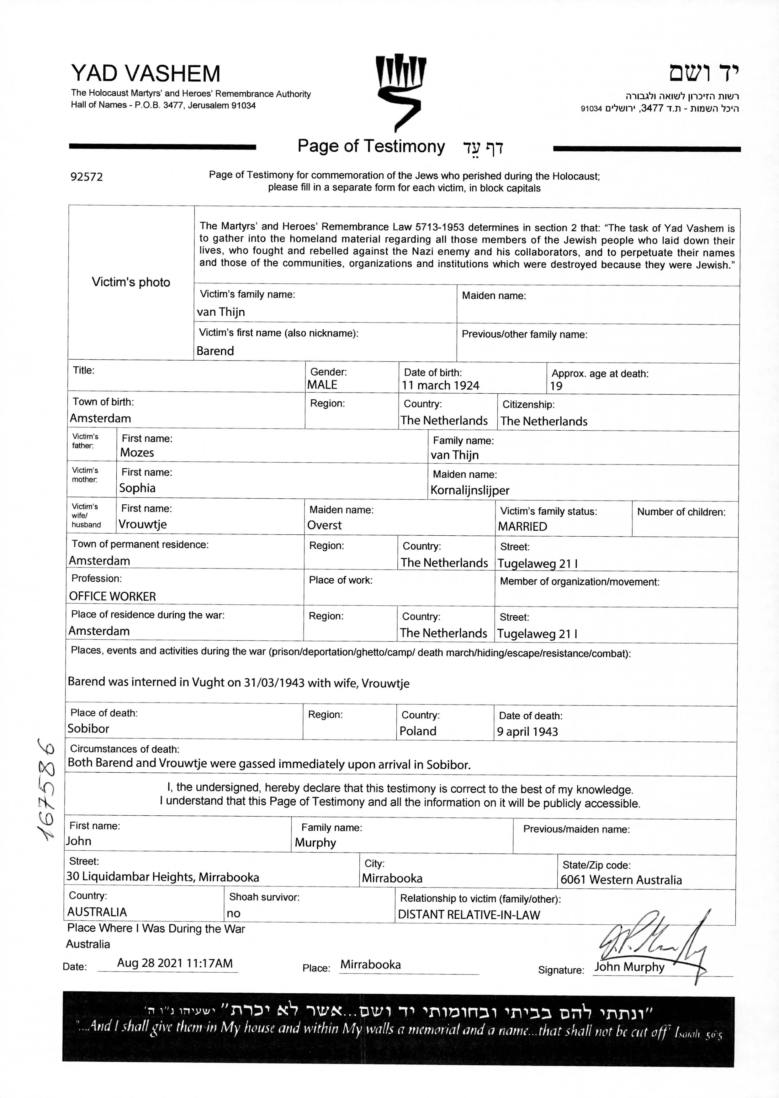 Barend van Thijn wurde im Jahr 1924 in Amsterdam, Niederlande geboren. Er war Büroangestellter. Vor dem Zweiten Weltkrieg lebte er in Amsterdam, Niederlande.