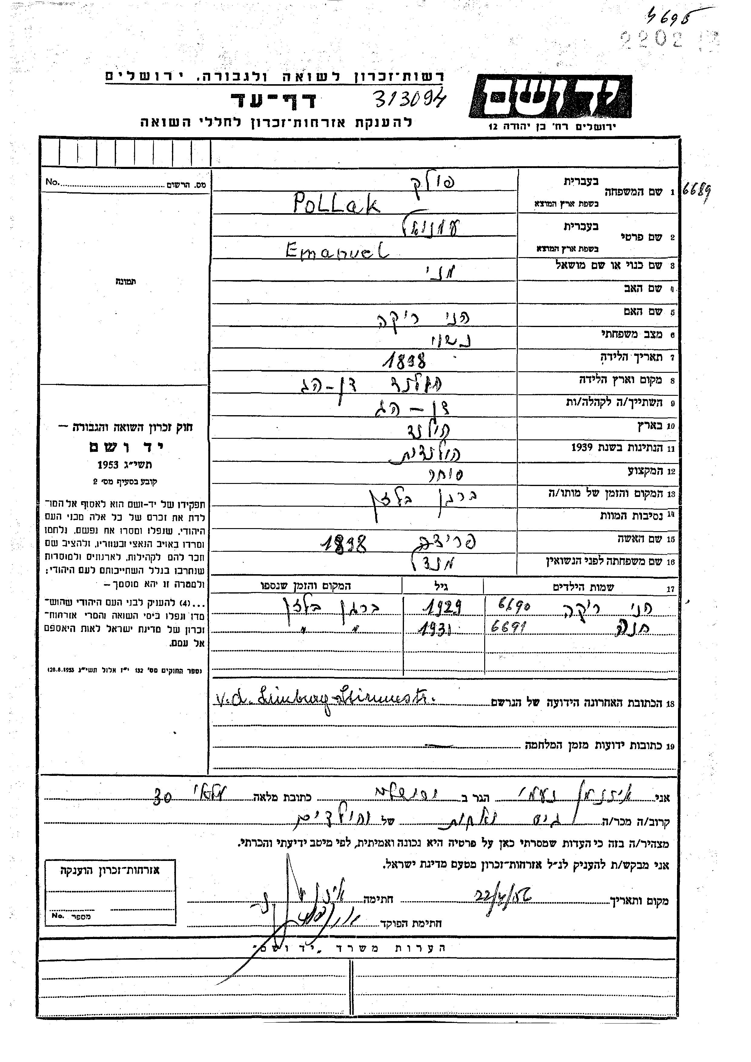Emanuel Pollak wurde im Jahr 1898 in Den Haag, Niederlande geboren. Er war der Sohn von Heni Rika. Er war Kaufmann/-frau und mit Frida, geb. Mandel Verheiratet. Vor dem Zweiten Weltkrieg lebte er in Den Haag, Niederlande.