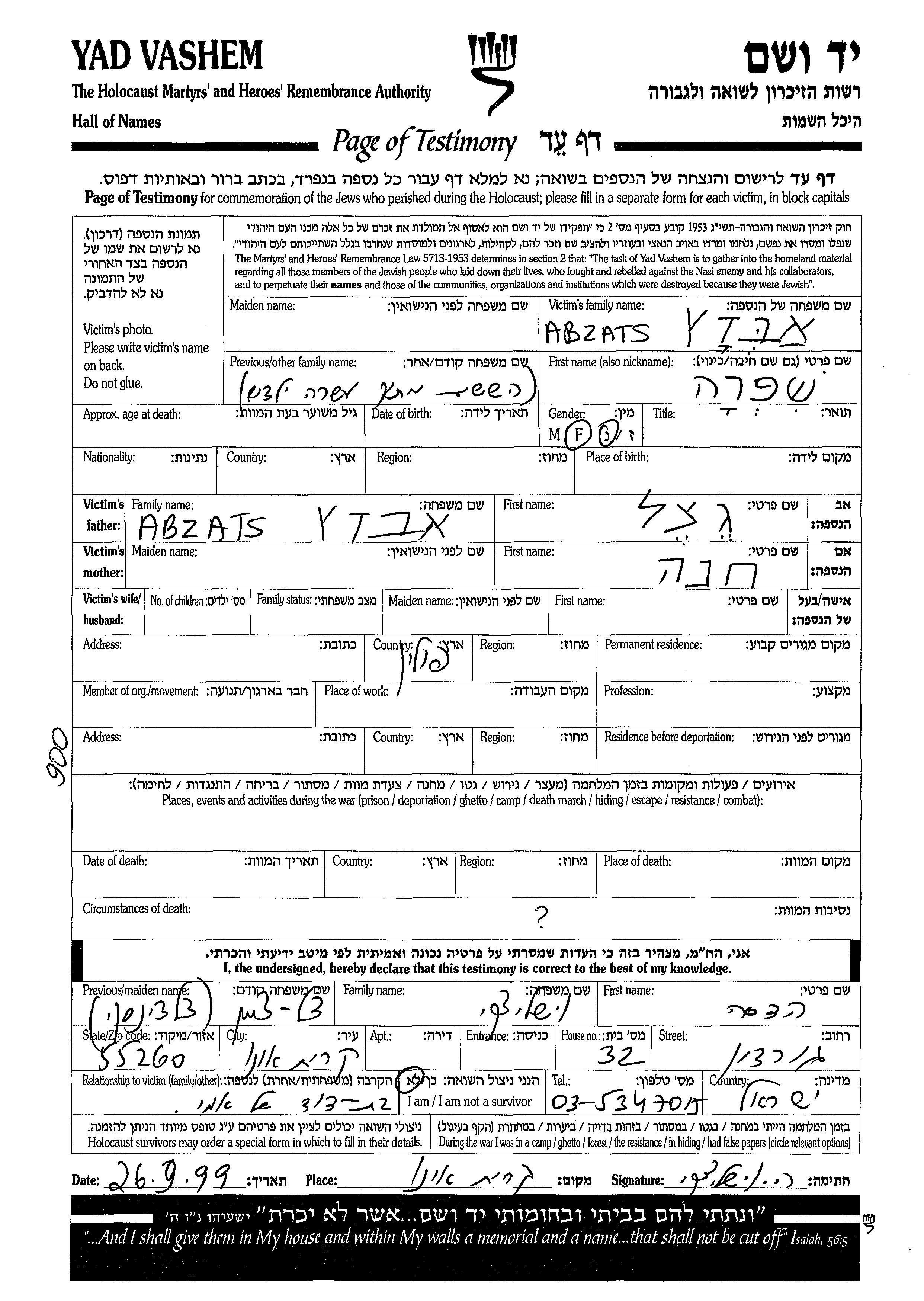 Shifra Abzatz wurde in unbekannter Ort geboren. Vor dem Zweiten Weltkrieg lebte sie in Przysucha, Polen.