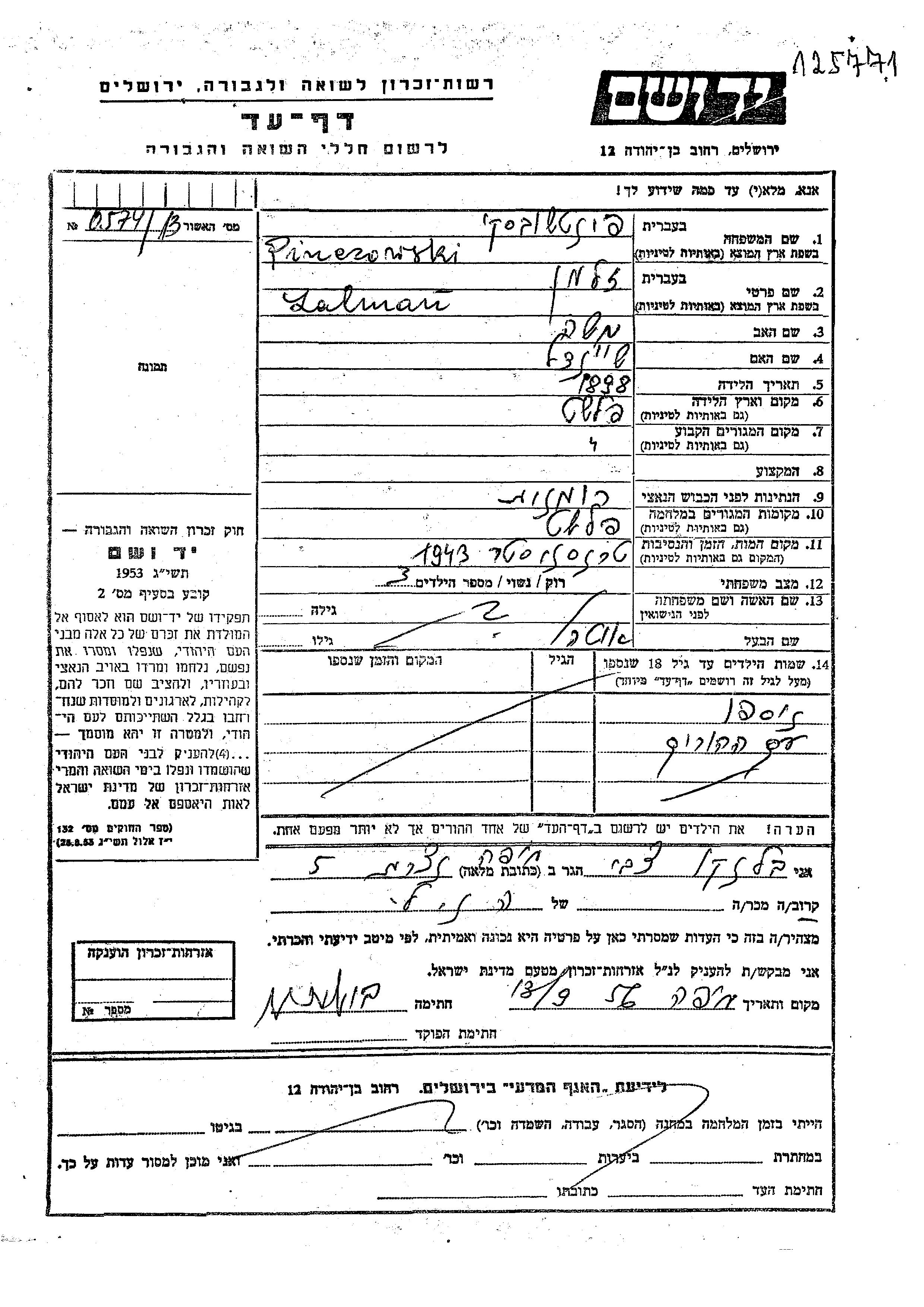 Zalman Pinczowski wurde im Jahr 1898 in Falesti, Rumänien geboren. Er war der Sohn von Moshe und Sheindl. Er war mit Ita Verheiratet. Vor dem Zweiten Weltkrieg lebte er in Falesti, Rumänien. Während des Krieges war er in Falesti, Rumänien.