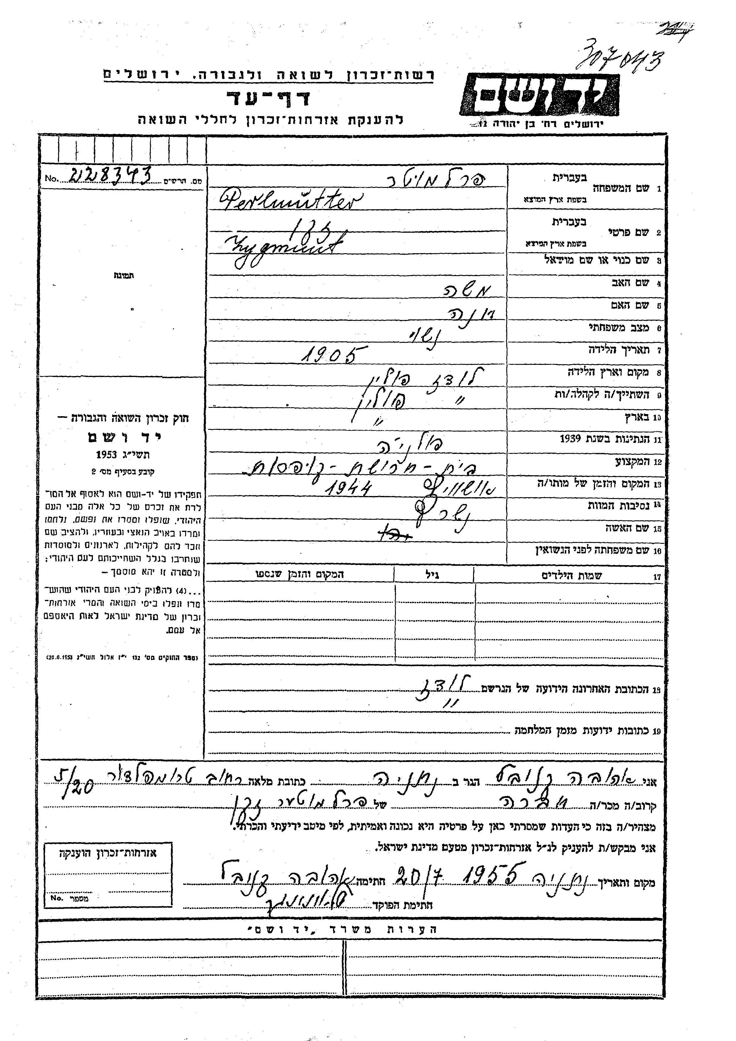 Zygmunt Zaken Perlmutter wurde im Jahr 1905 in Lodz, Polen geboren. Er war der Sohn von Moshe und Khana. Er war Verheiratet. Vor dem Zweiten Weltkrieg lebte er in Lodz, Polen.