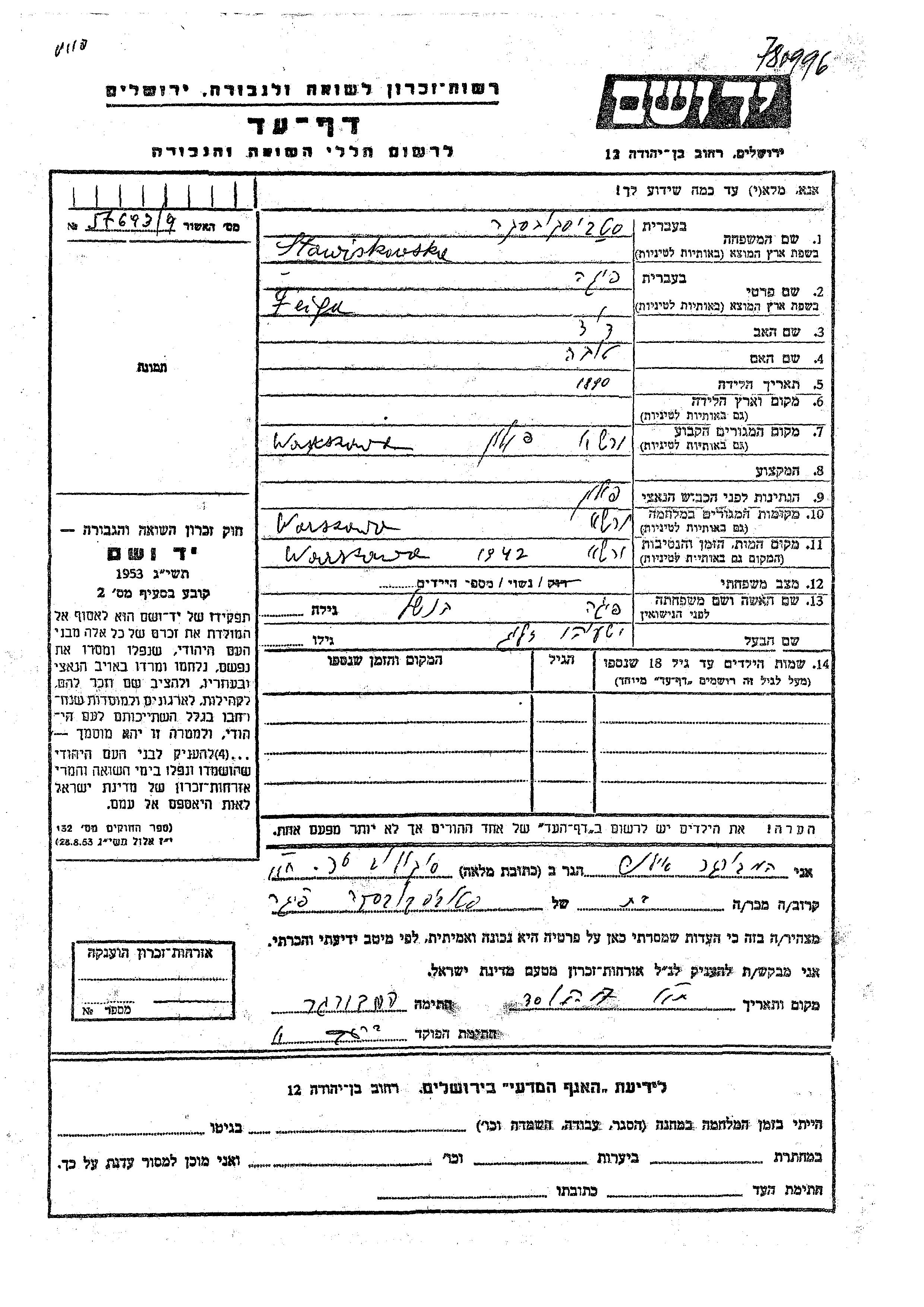 Feiga Stawiskowski, geb. Bushel wurde im Jahr 1890 geboren. Sie war die Tochter von David und Tova. Sie war mit Ishiyahu Zelig Verheiratet. Vor dem Zweiten Weltkrieg lebte sie in Warszawa, Polen. Während des Krieges war sie in Warszawa, Polen.