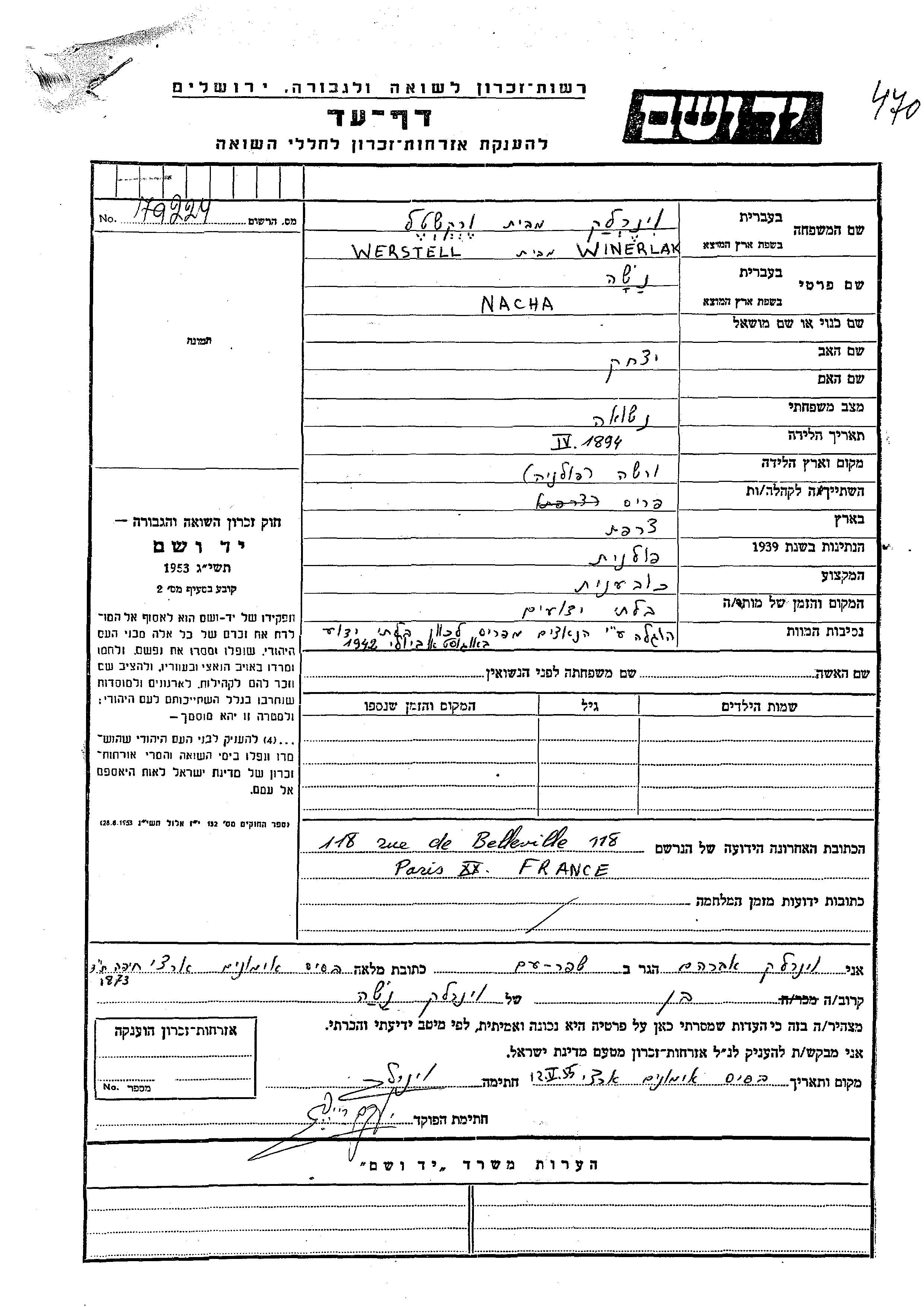 Nacha Nesha Winerlak, geb. Werkstell wurde im Jahr 1894 in Warszawa, Polen geboren. Sie war die Tochter von Yitzkhak. Sie war Hutmacher/-in. Vor dem Zweiten Weltkrieg lebte sie in Paris, Frankreich. Während des Krieges war sie in Paris, Frankreich.