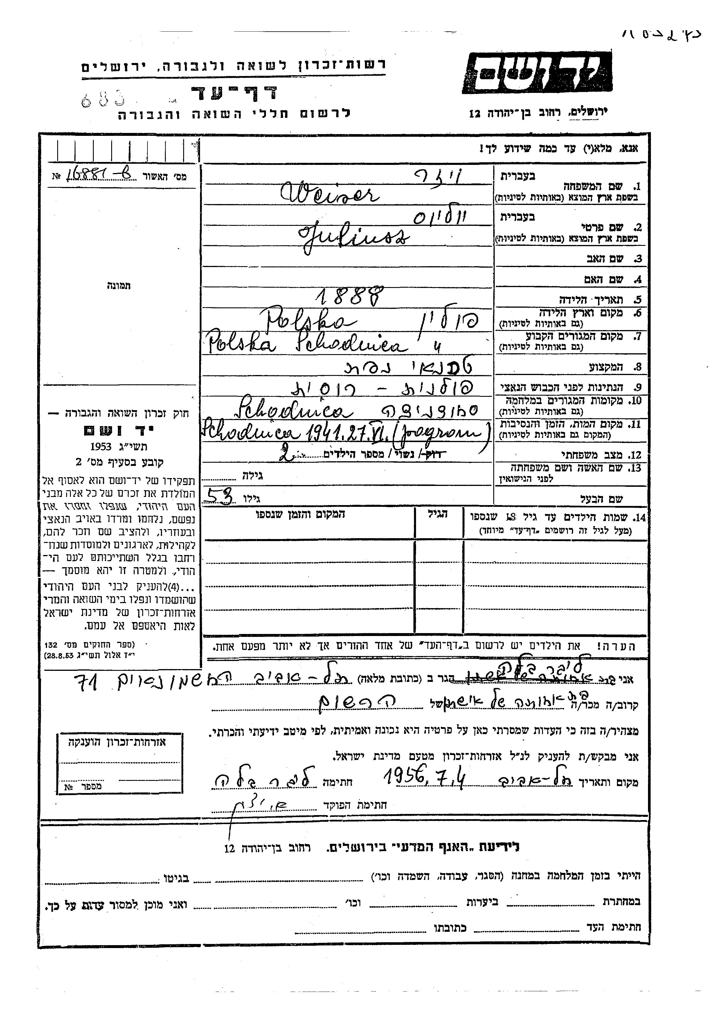 Julius Weizer wurde im Jahr 1888 in Polen geboren. Er war טכנאי נפט und Verheiratet. Vor dem Zweiten Weltkrieg lebte er in Schodnica, Polen. Während des Krieges war er in Schodnica, Polen.