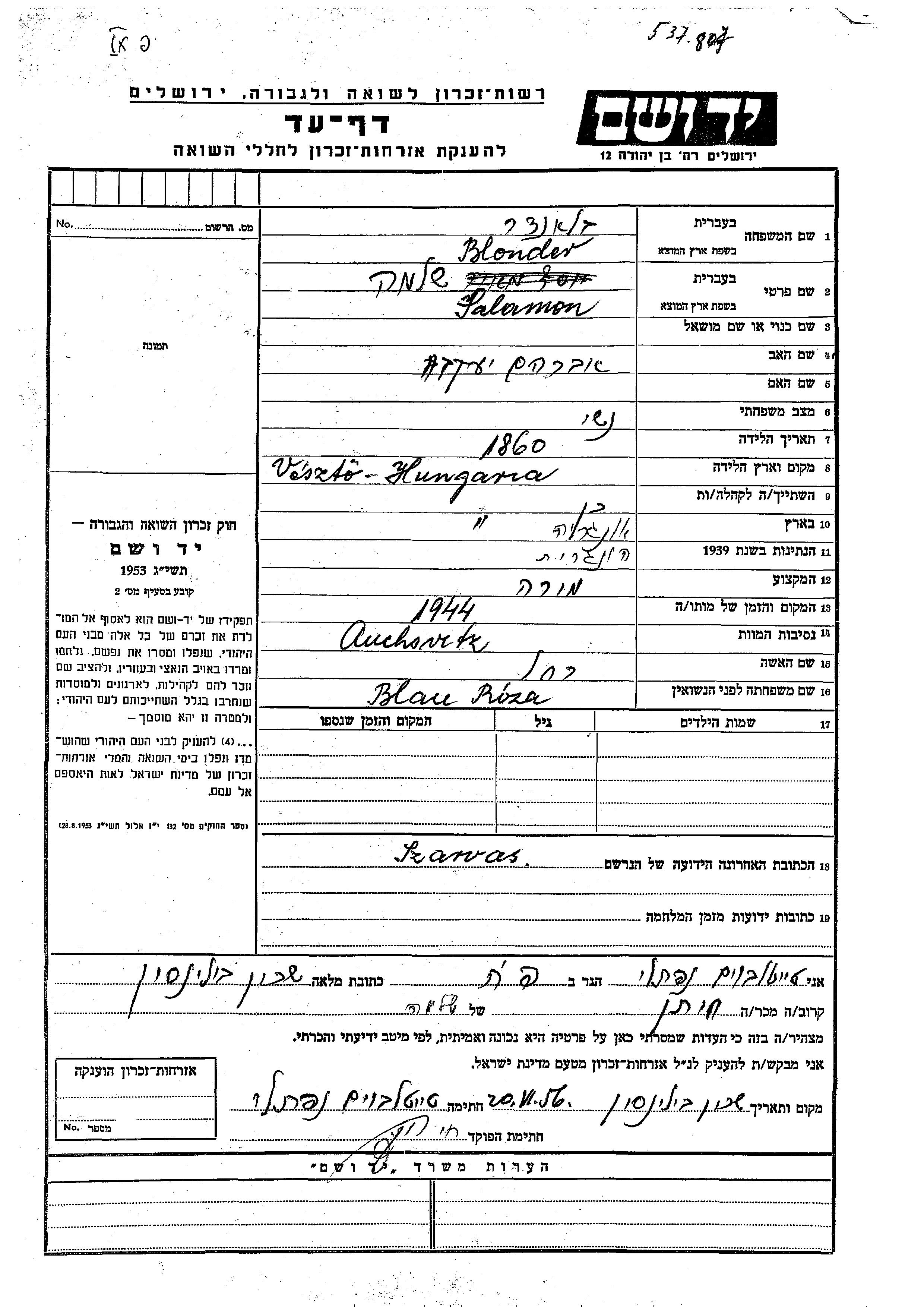 Salomon Blonder wurde im Jahr 1860 in Veszto, Ungarn geboren. Er war Lehrer/in. Vor dem Zweiten Weltkrieg lebte er in Szarvas, Ungarn.