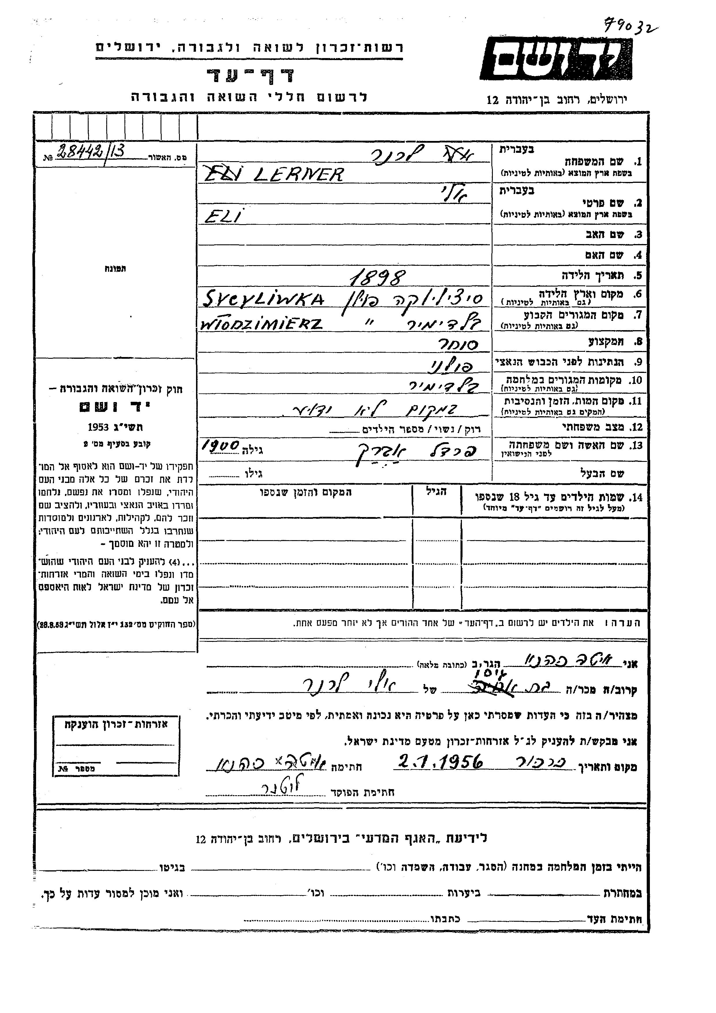 Eli Lerner wurde im Jahr 1898 in Sycyliwka, Polen geboren. Er war Kaufmann/-frau. Vor dem Zweiten Weltkrieg lebte er in Wlodzimierz, Polen. Während des Krieges war er in Wlodzimierz, Polen.