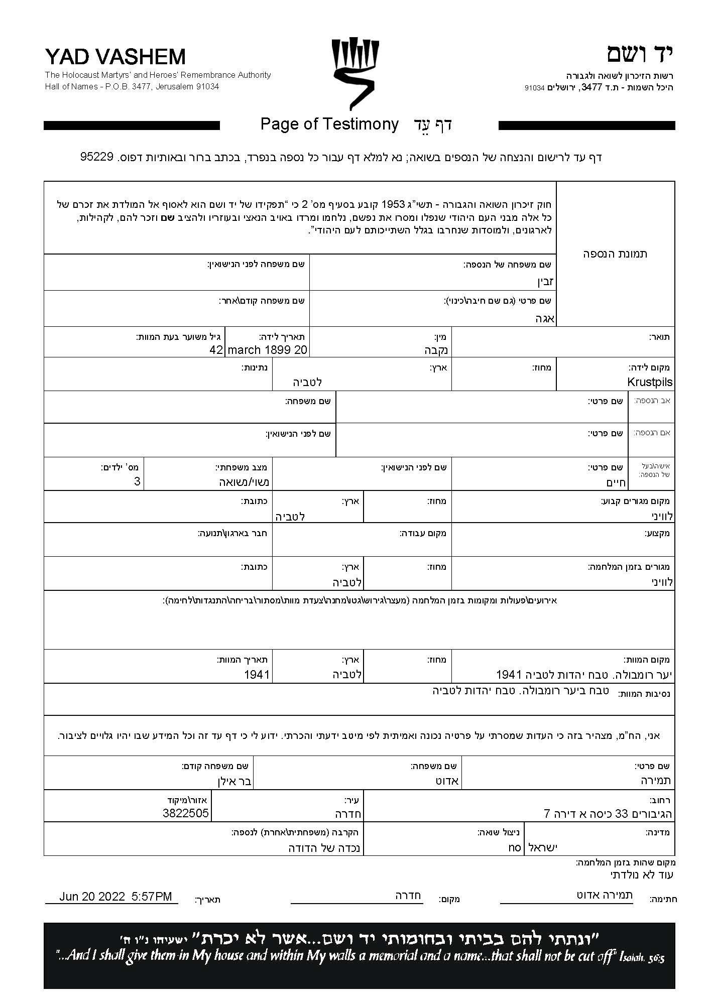 Aga wurde in der Schoah ermordet. Todesort: Rumbula, Lettland im Jahr 1941.