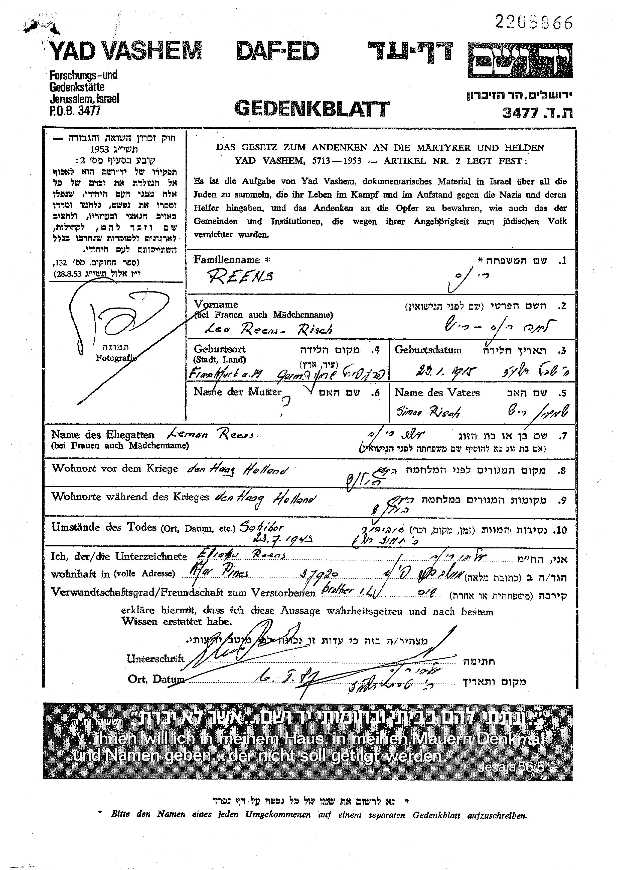 Lea Reines Reens, geb. Risch wurde im Jahr 1915 in Frankfurt Main, Deutsches Reich geboren. Vor dem Zweiten Weltkrieg lebte sie in Den Haag, Niederlande.
