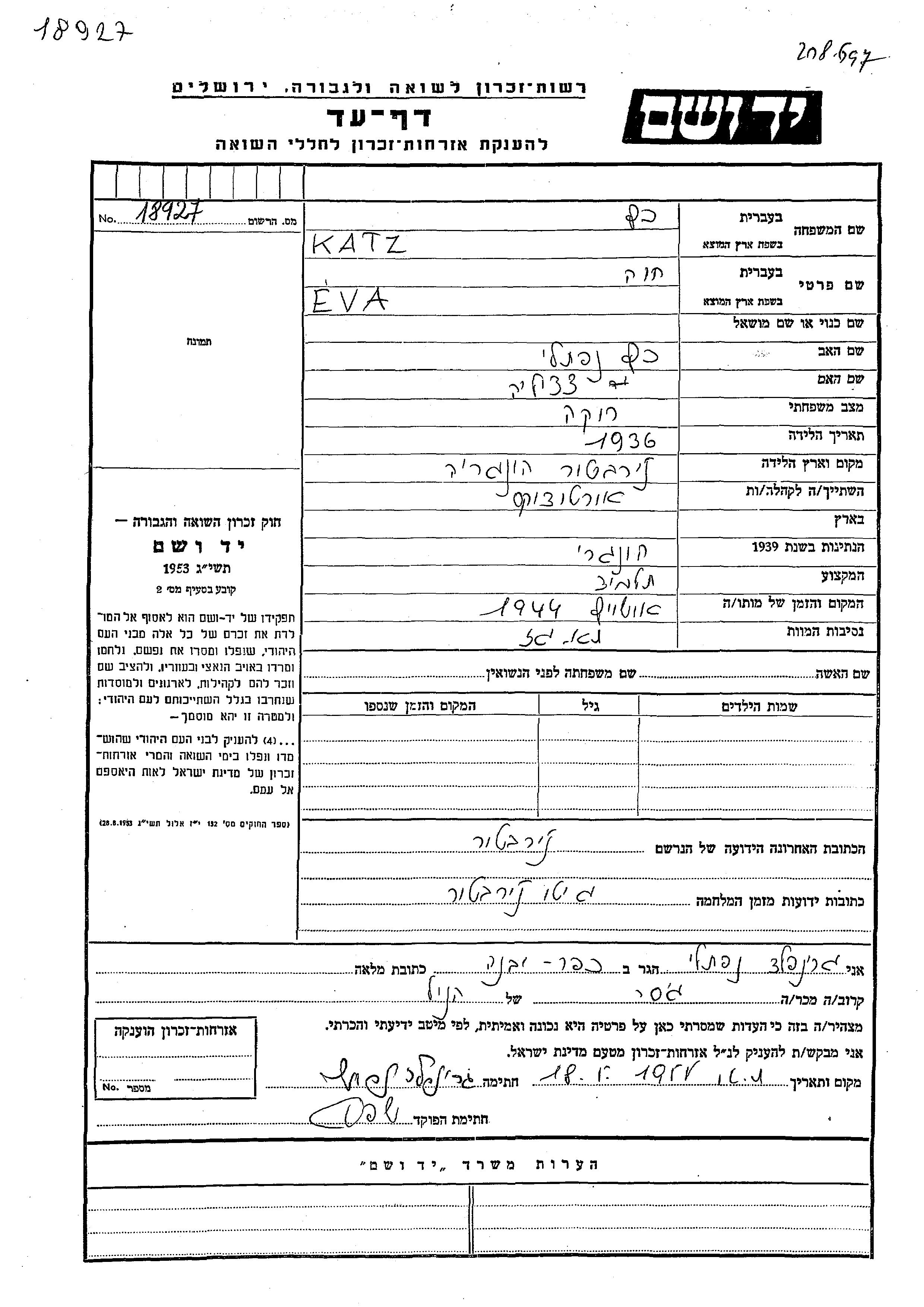 Katz Eva Khava 1936 Nyirbator, Ungarn Gedenkblatt