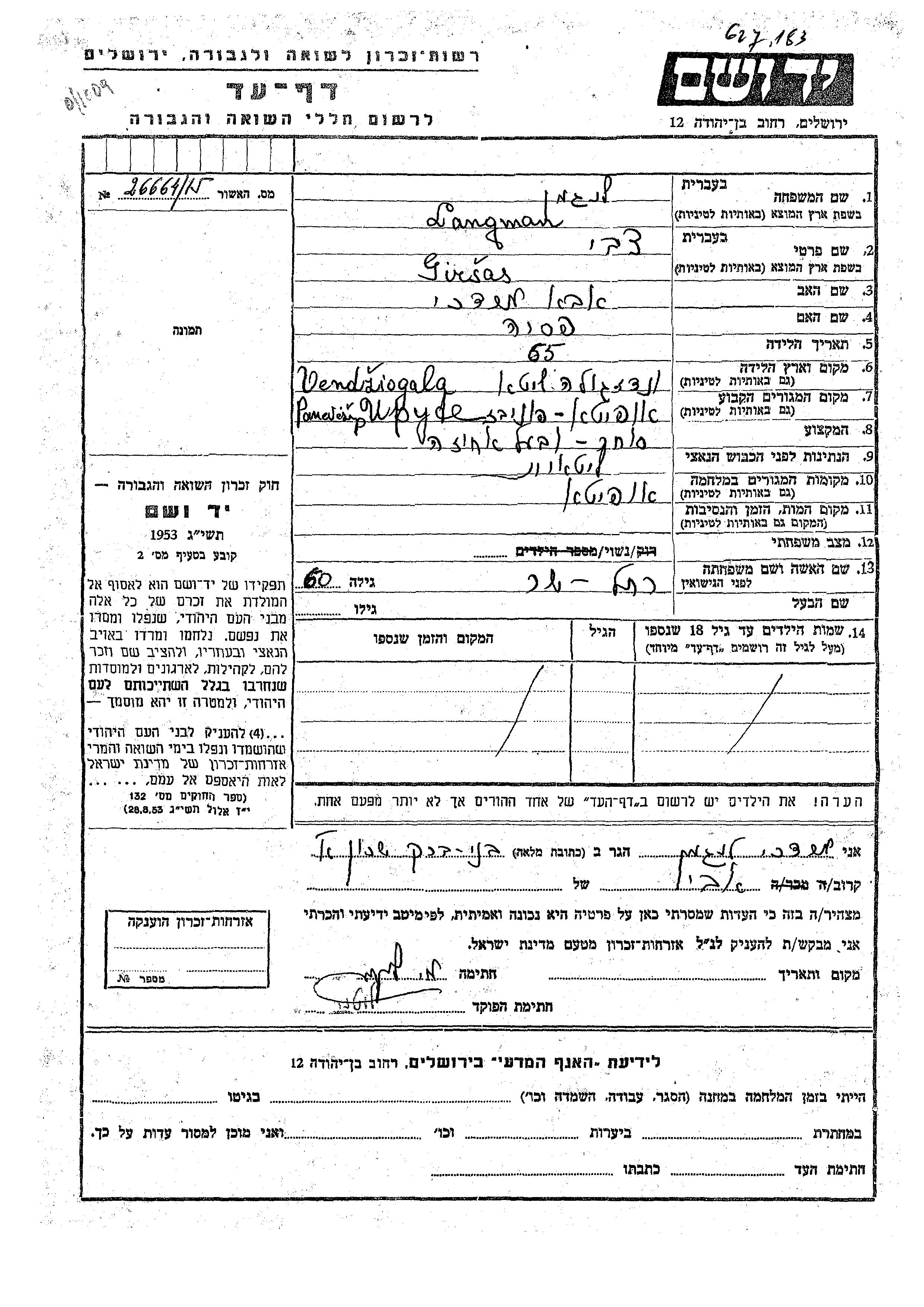 Girsas Tzvi Langman wurde in Vendziogala, Litauen geboren. Er war der Sohn von Mordekhai und Pesia. Er war Kaufmann/-frau und mit Rakhel Shear, geb. Sher Verheiratet. Vor dem Zweiten Weltkrieg lebte er in Upyte, Litauen. Während des Krieges war er in Upyte, Litauen.