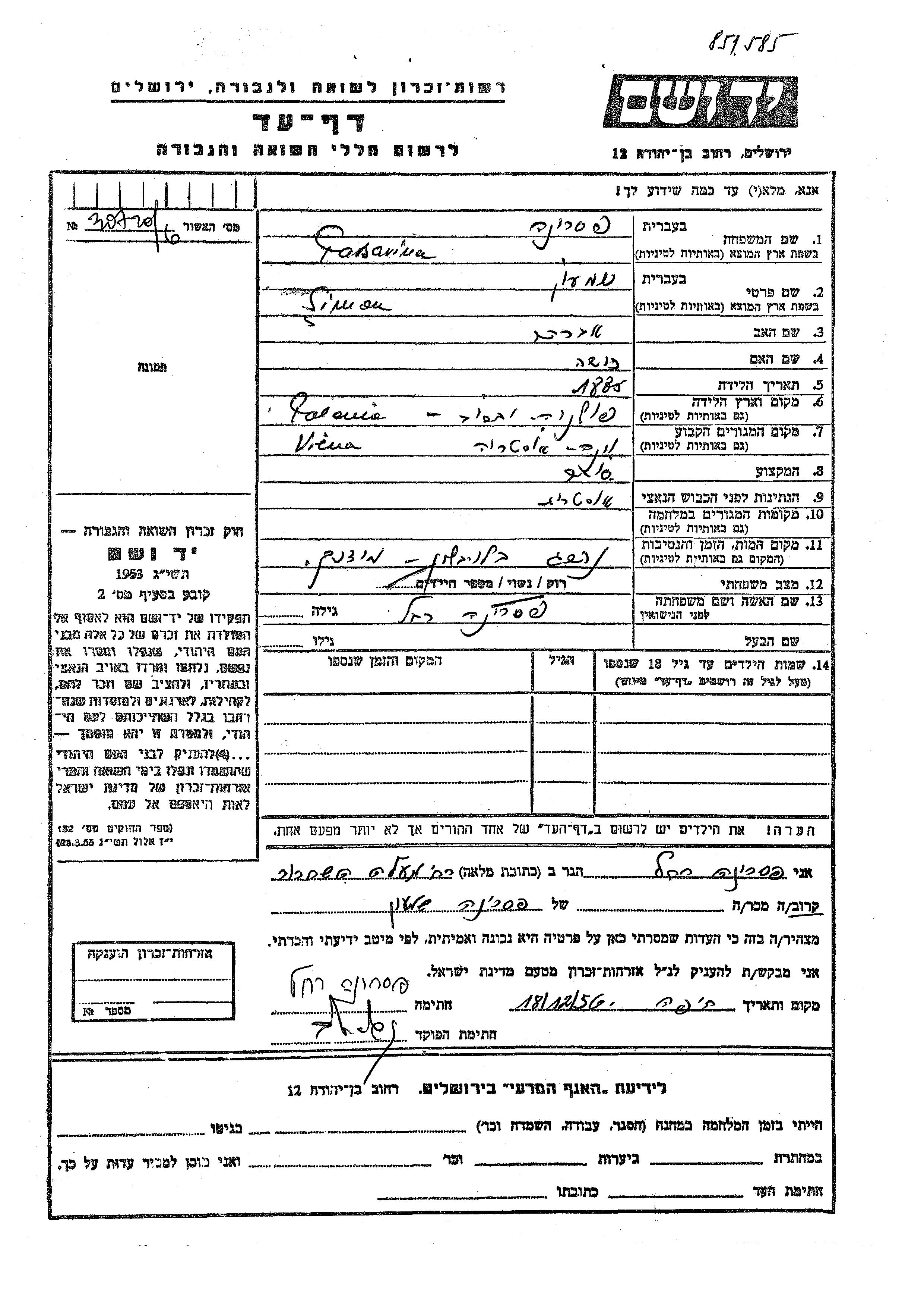 Simon Pasarina wurde im Jahr 1885 in Jaworow, Polen geboren. Er war der Sohn von Avraham und Risha. Er war Kaufmann/-frau und mit Rakhel Verheiratet. Vor dem Zweiten Weltkrieg lebte er in Vienna, Österreich.