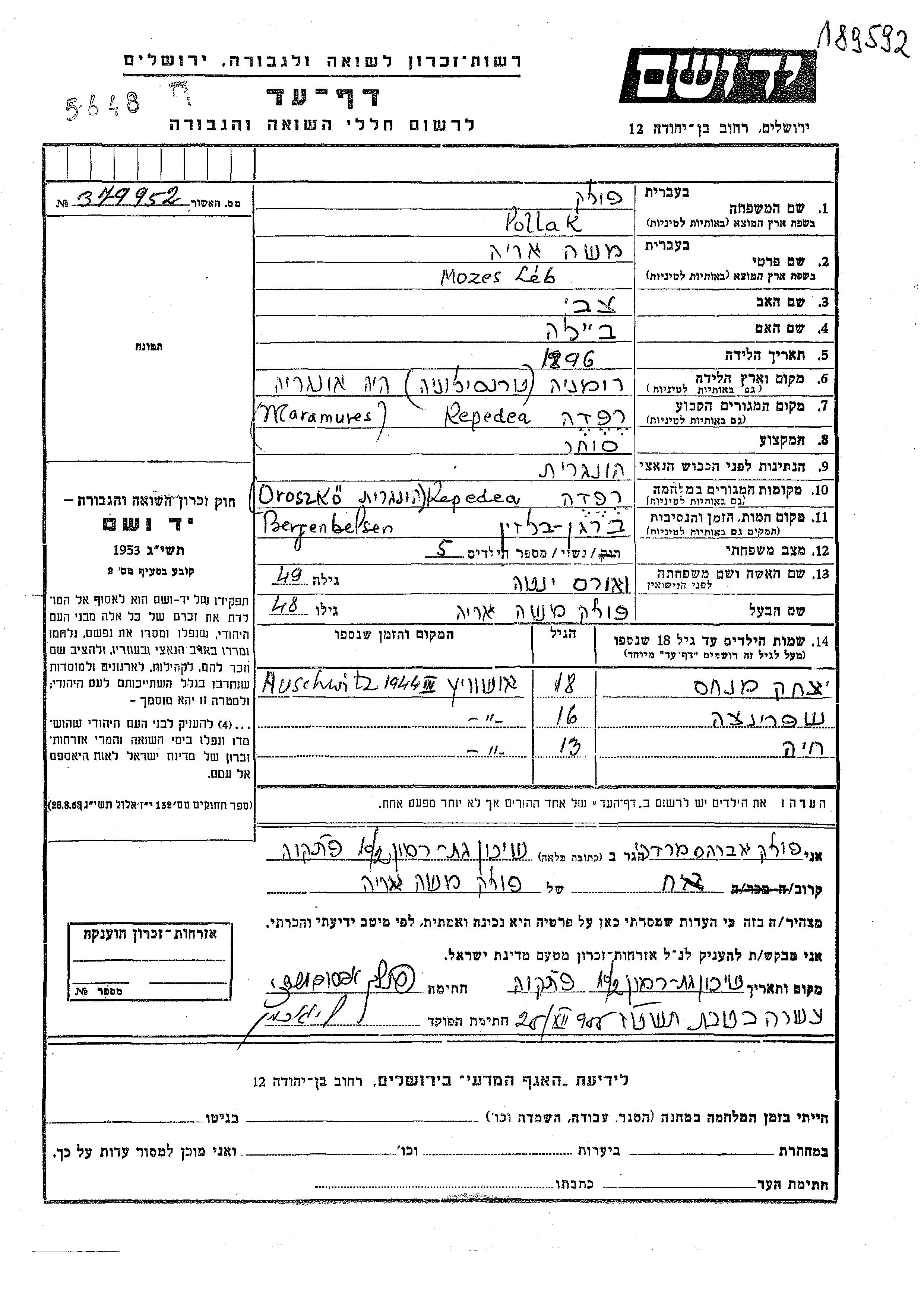 Moshe Leb Arie Pollak wurde im Jahr 1896 in Transylvania, Rumänien geboren. Er war der Sohn von Tzvi und Beila. Er war Kaufmann/-frau und mit Yenta, geb. Vorsh Verheiratet. Vor dem Zweiten Weltkrieg lebte er in Repedea, Rumänien. Während des Krieges war er in Repedea, Rumänien.