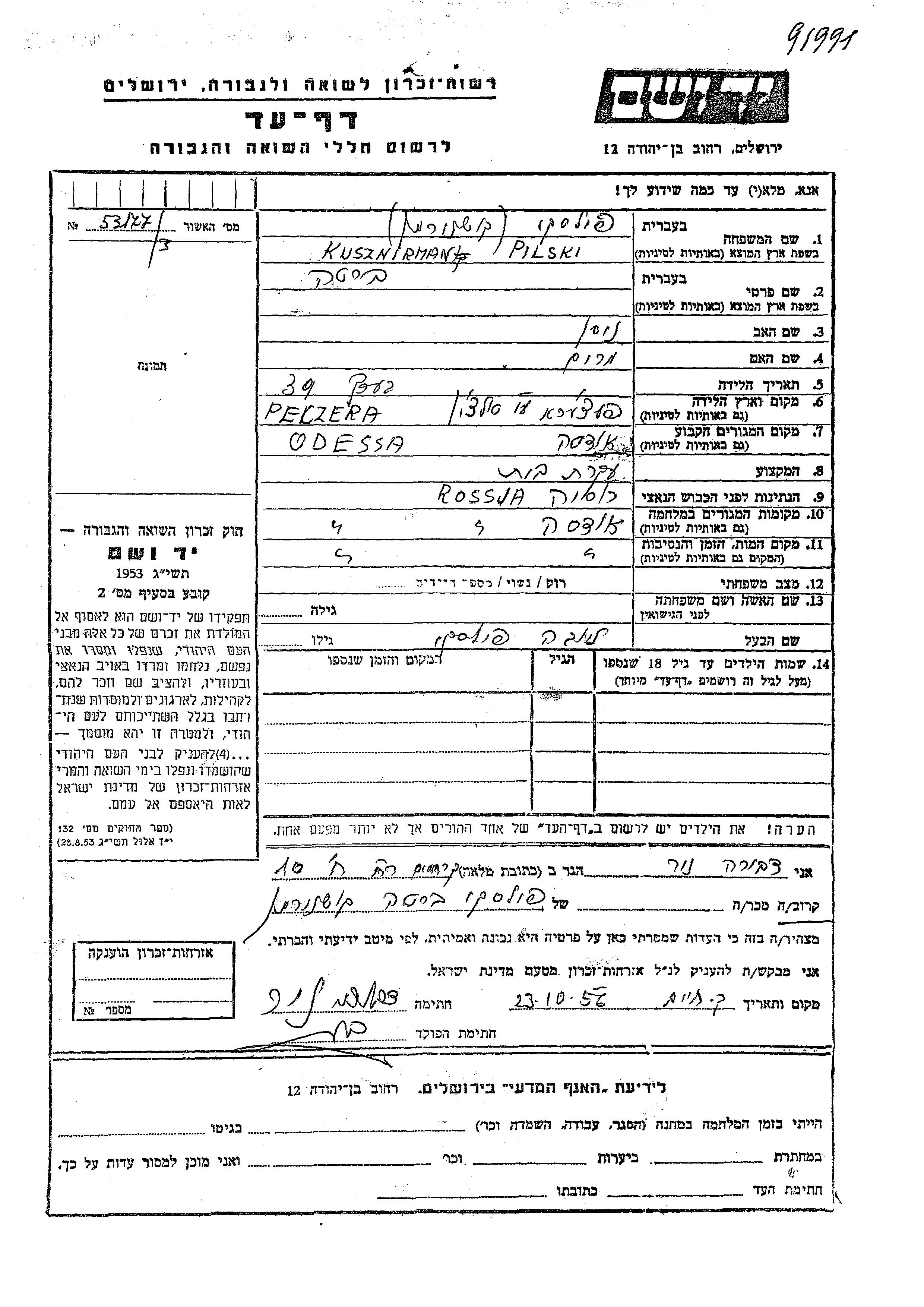 Berta Pilski, geb. Kusznirman wurde in Pechora, Ukraine (UdSSR) geboren. Sie war die Tochter von Nisan und Miriam. Sie war Hausfrau und mit Leiba Verheiratet. Vor dem Zweiten Weltkrieg lebte sie in Odessa, Ukraine (UdSSR). Während des Krieges war sie in Odessa, Ukraine (UdSSR).