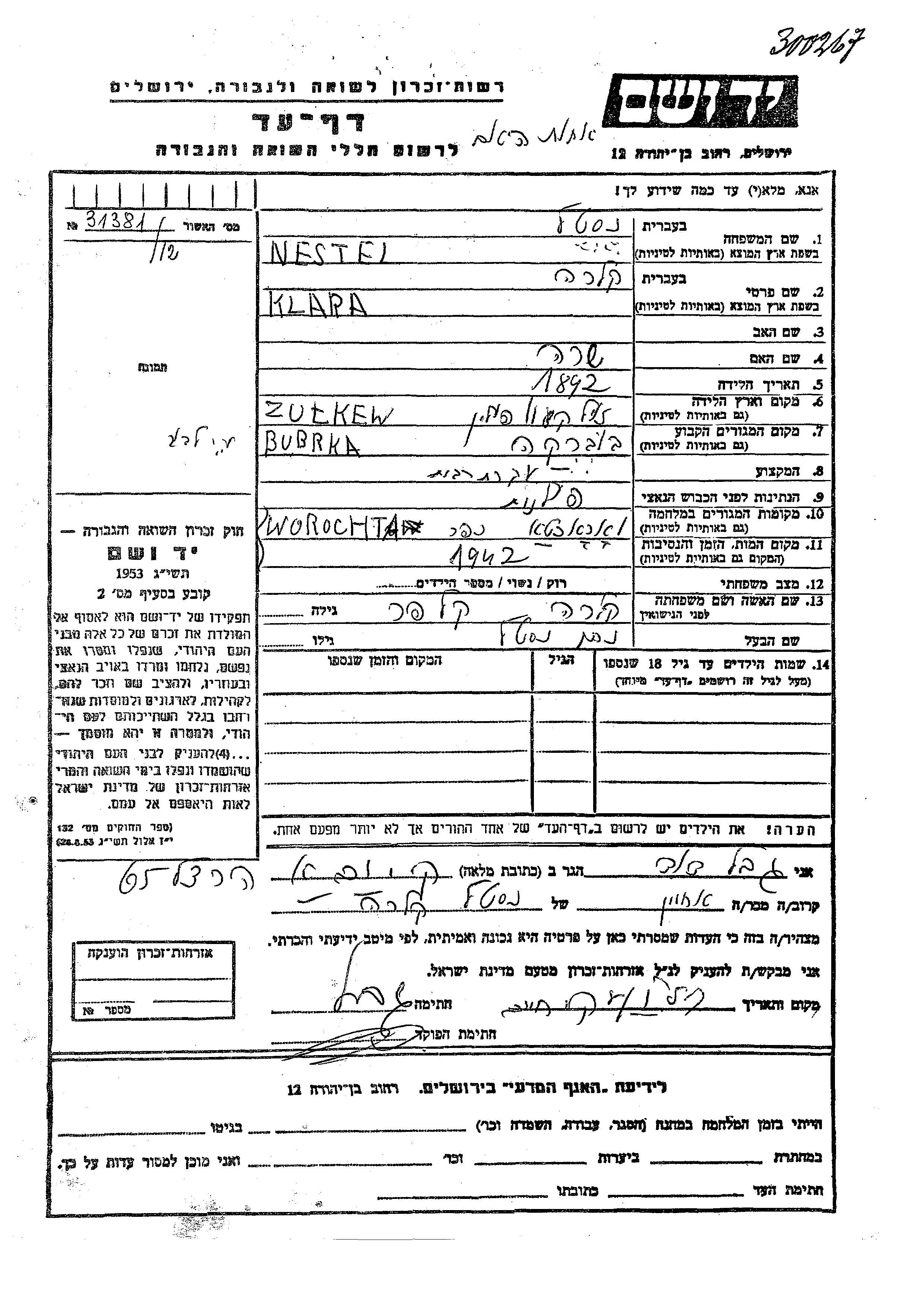 Klara Nestel, geb. Klaper wurde im Jahr 1892 in Zulkow, Polen geboren. Sie war die Tochter von Sara. Sie war Hausfrau und mit Natan Verheiratet. Vor dem Zweiten Weltkrieg lebte sie in Bubryk, Polen. Während des Krieges war sie in Worochta, Polen.