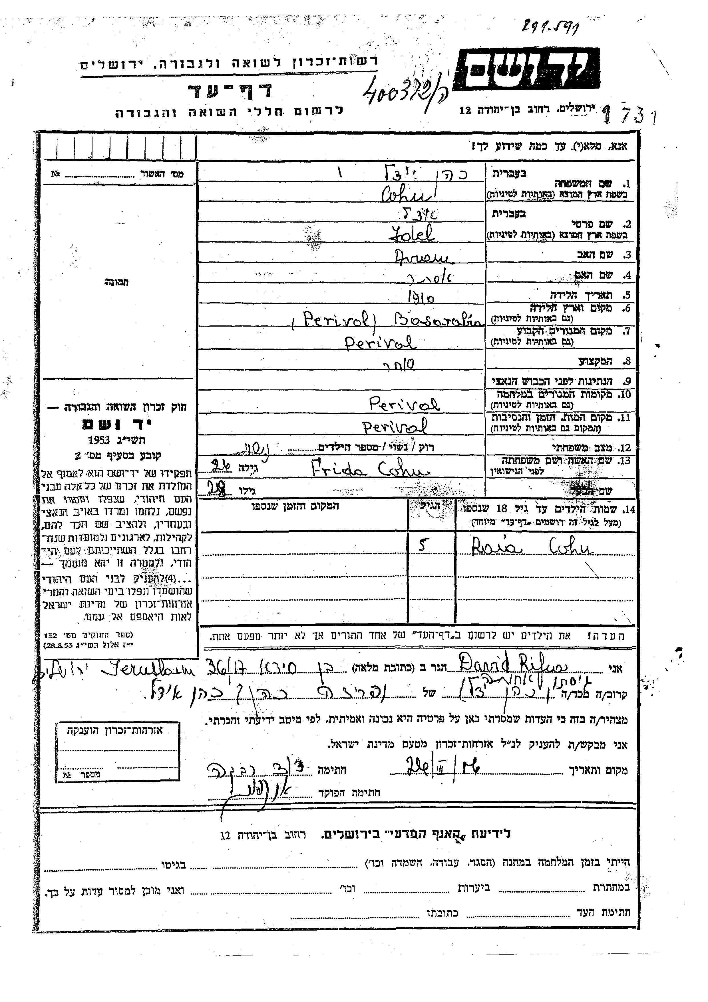Ydel Cohn wurde im Jahr 1910 in Cornesti Pereval, Rumänien geboren. Er war der Sohn von Avram und Ester. Er war Kaufmann/-frau und mit Frida Verheiratet. Vor dem Zweiten Weltkrieg lebte er in Cornesti Pereval, Rumänien. Während des Krieges war er in Cornesti Pereval, Rumänien.