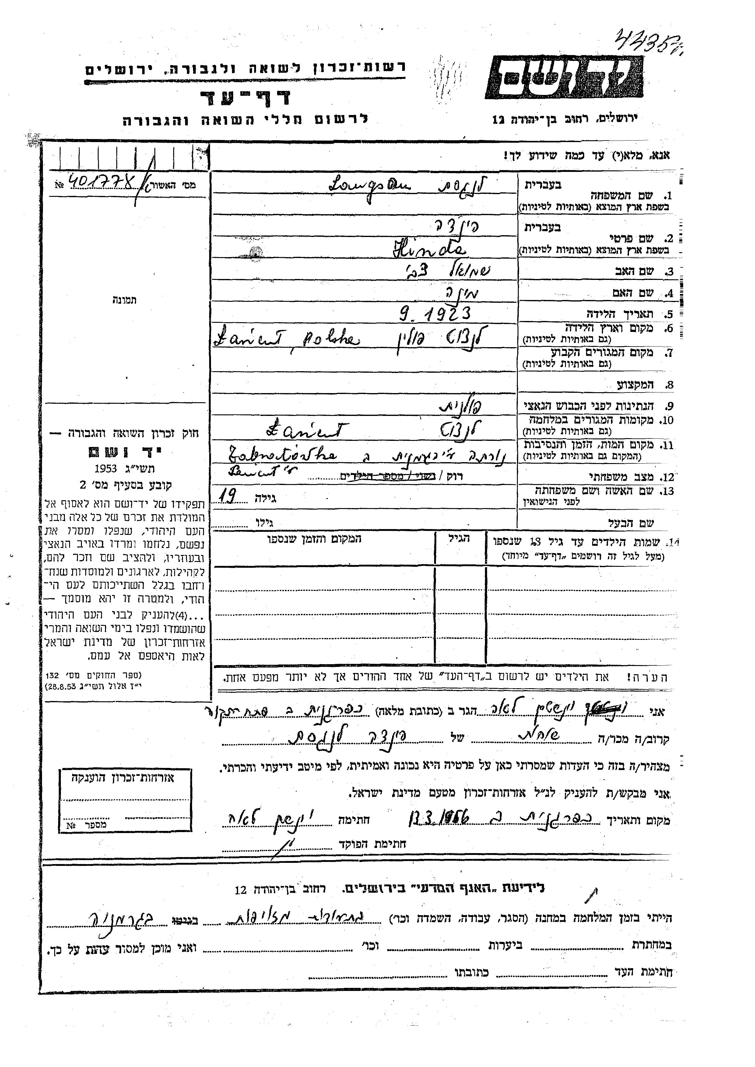 Hinde Langsam wurde im Jahr 1923 in Lancut, Polen geboren. Sie war die Tochter von Shmuel Tzvi und Mina. Sie war Ledig. Während des Krieges war sie in Lancut, Polen.