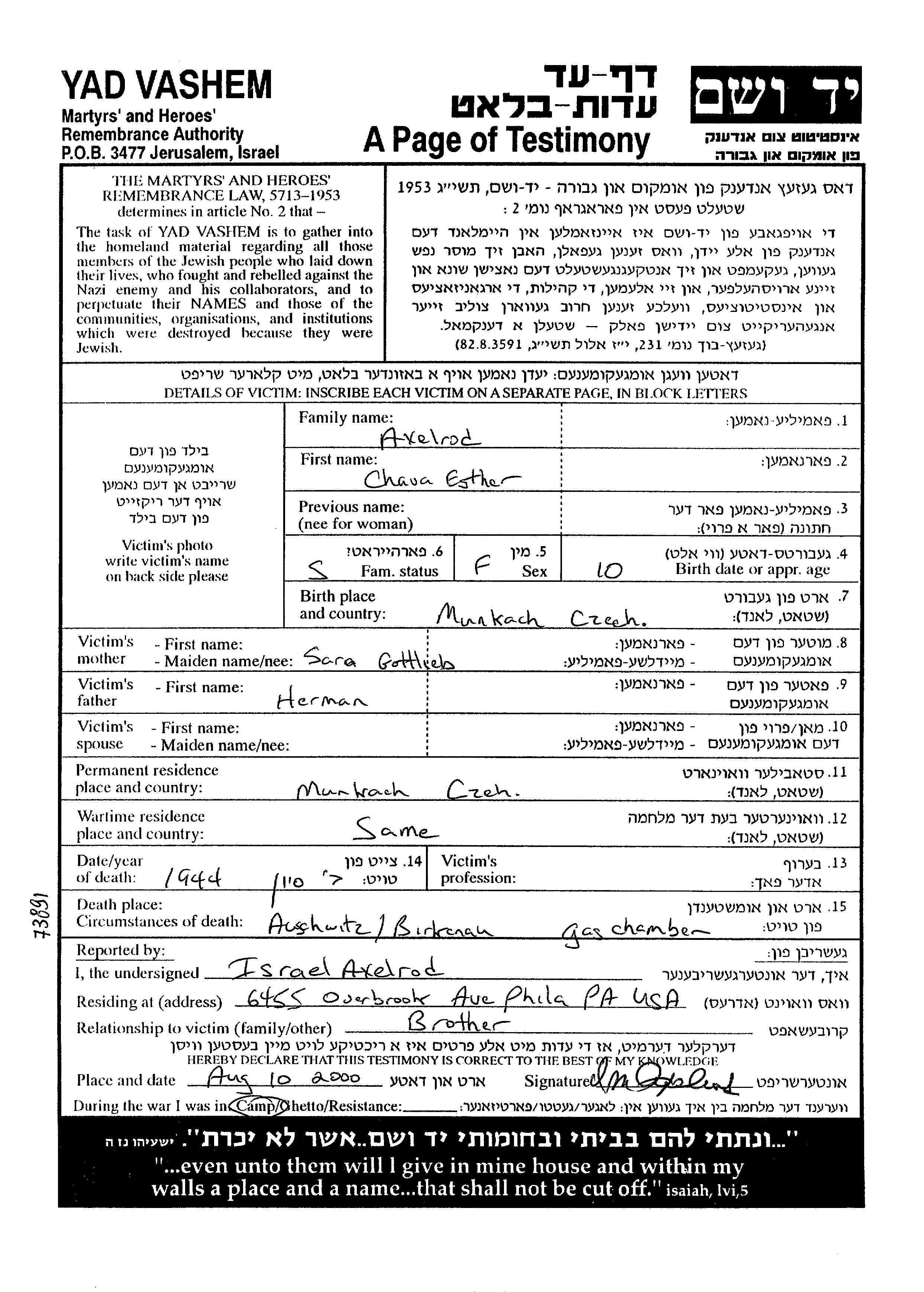 Axelrod Chava Esther Munkac, Tschechoslowakei Gedenkblatt