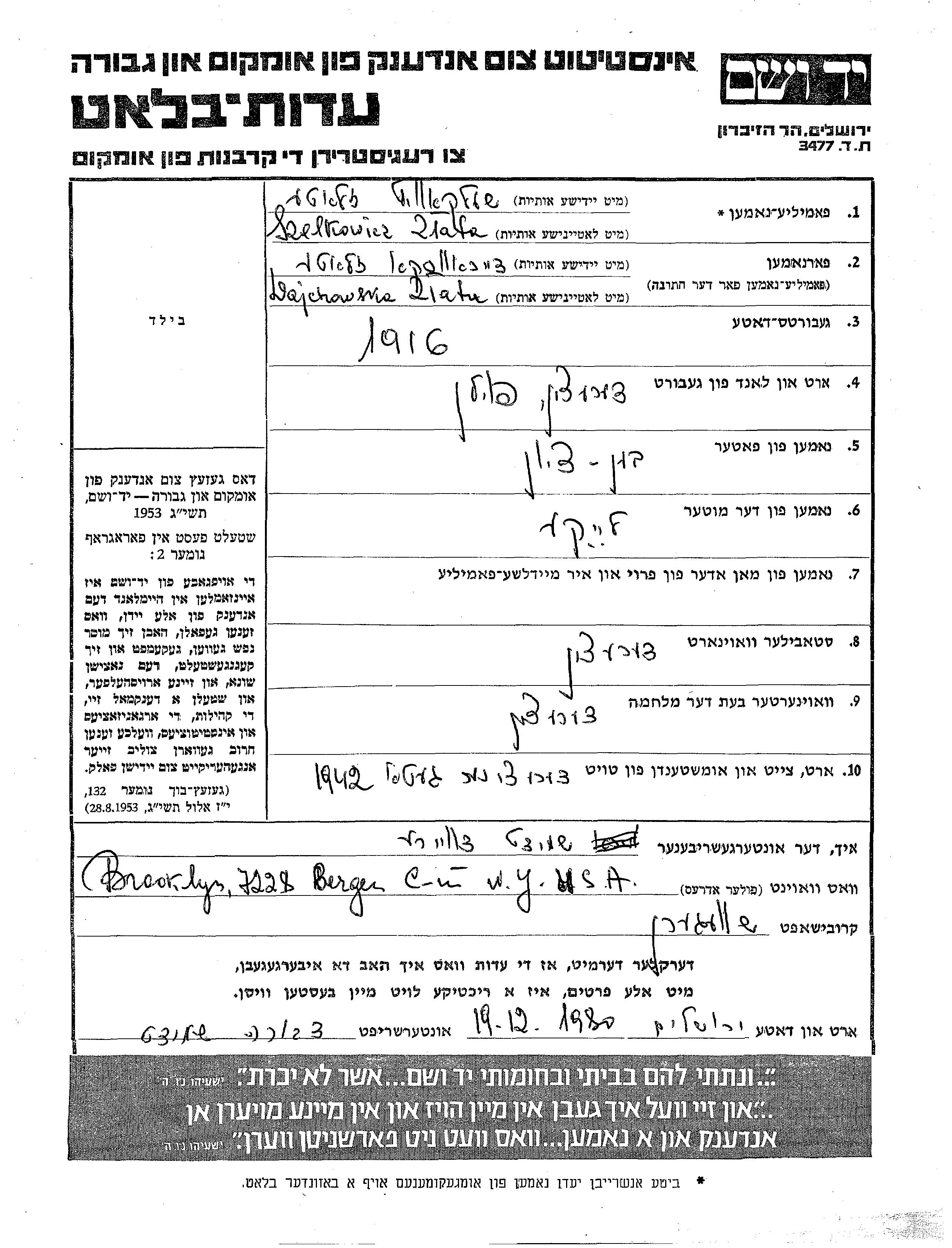 Zlate Szelkowicz, geb. Dajchowska wurde im Jahr 1916 in Dereczyn, Polen geboren. Sie war die Tochter von Bentzion und Lea. Vor dem Zweiten Weltkrieg lebte sie in Dereczyn, Polen. Während des Krieges war sie in Dereczyn, Polen.