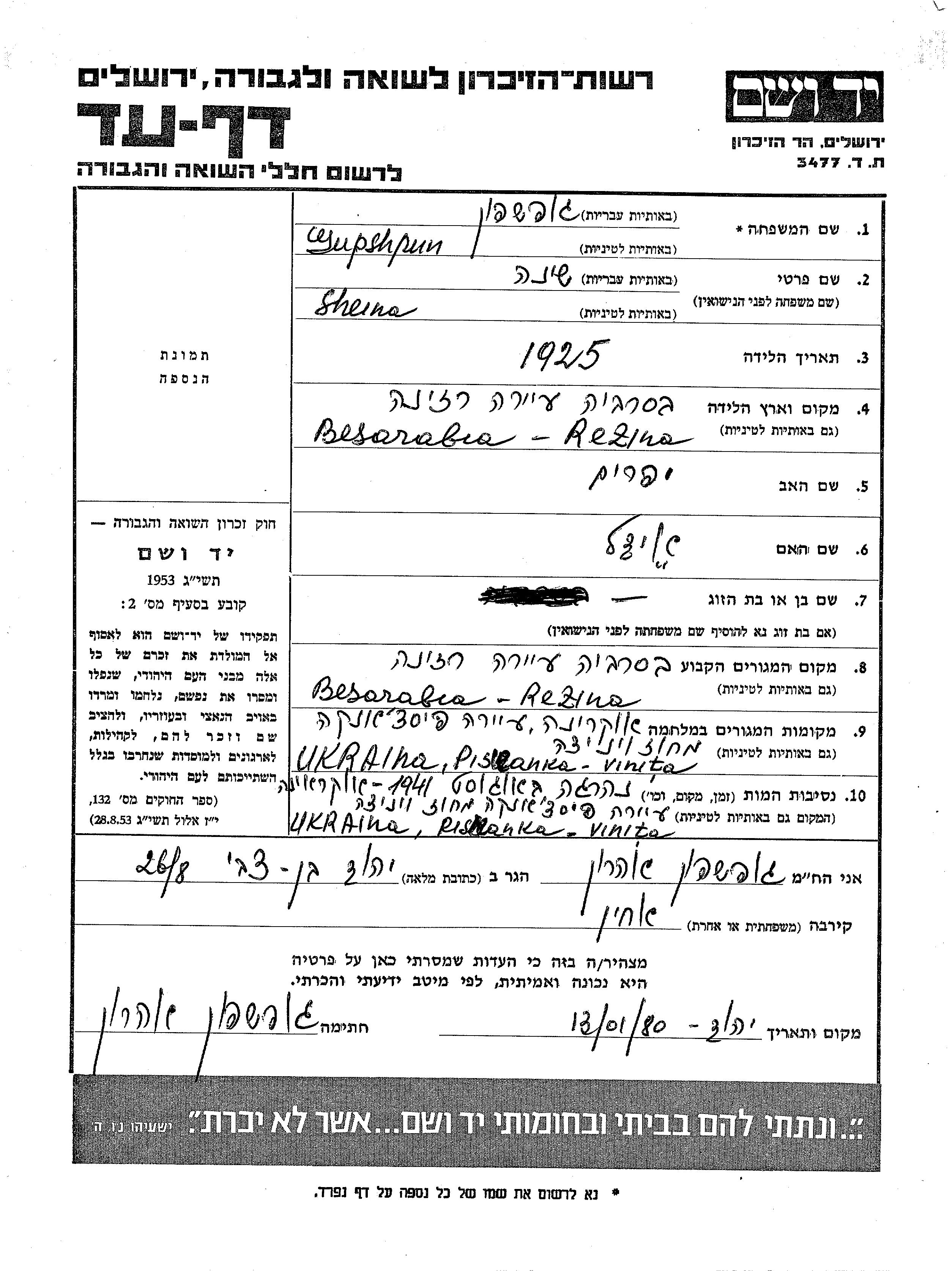 Gupshpun Sheina 1925 Rezina, Rumänien Gedenkblatt