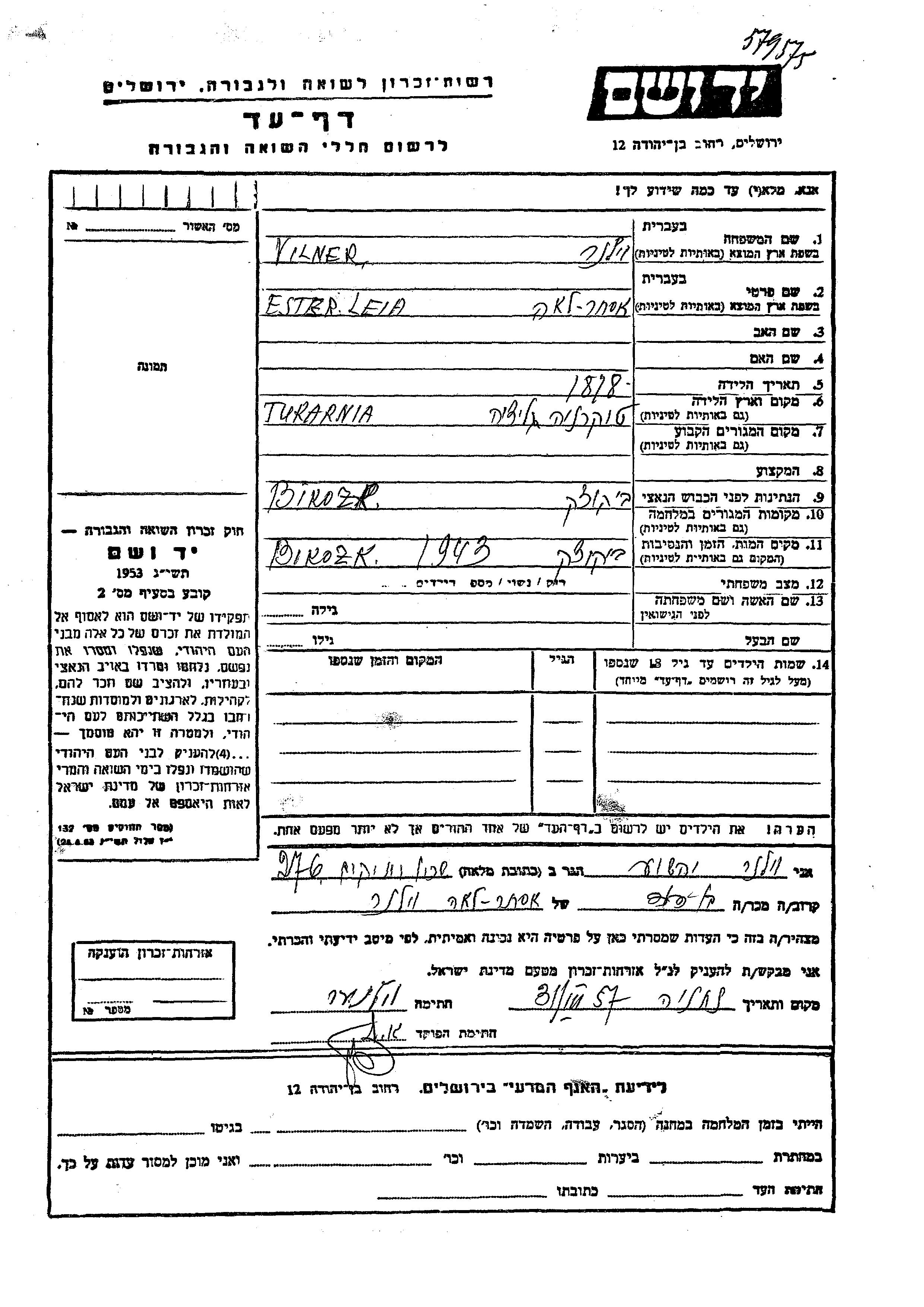 Leia Ester Vilner wurde im Jahr 1898 in Tokarnia, Polen geboren. Während des Krieges war sie in Bukowsk, Polen.