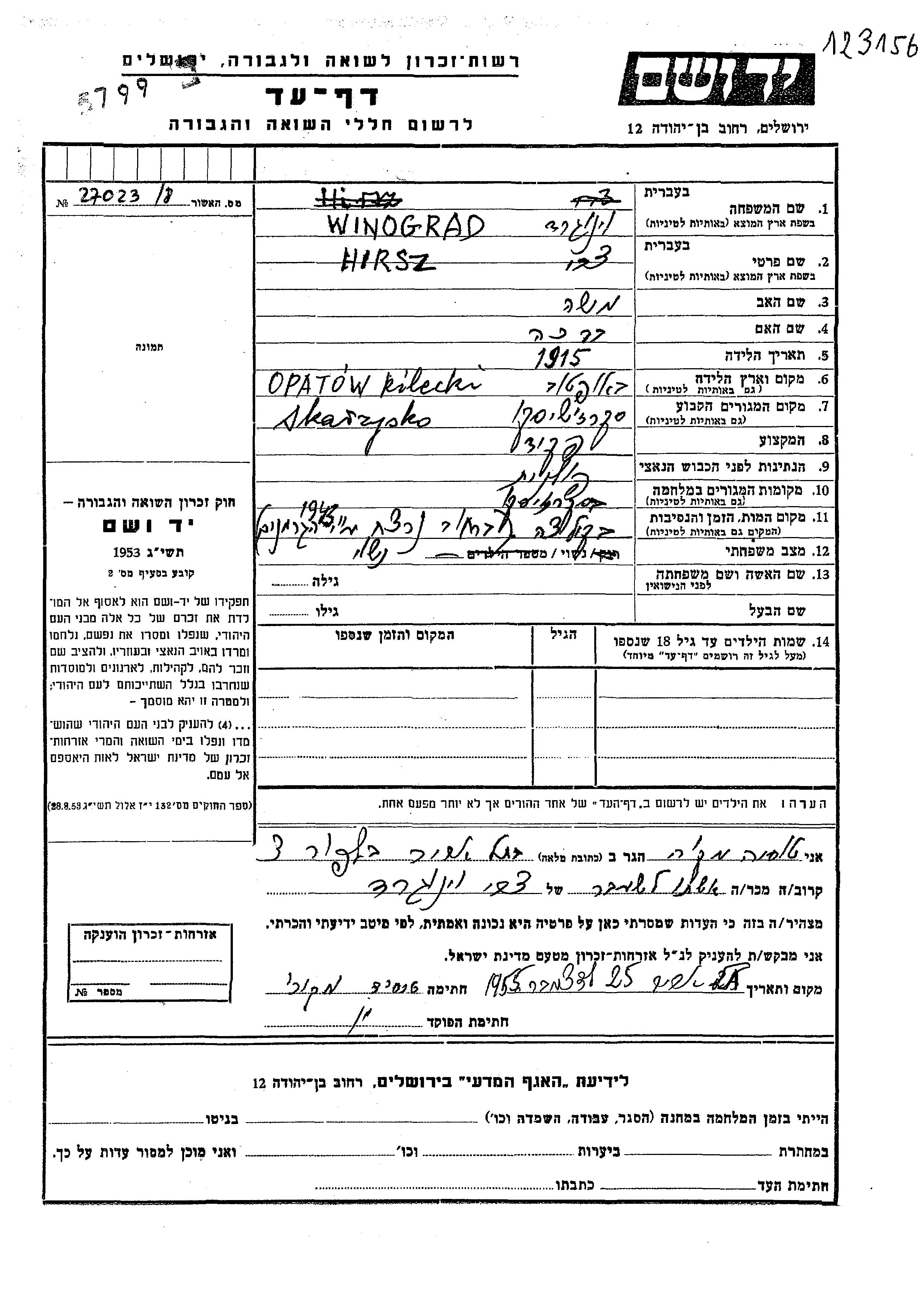 Hirsz Tzvi Winograd wurde im Jahr 1915 in Opatow, Polen geboren. Er war der Sohn von Moshe und Brakha. Er war Angestellte/-r und Verheiratet. Vor dem Zweiten Weltkrieg lebte er in Skarzysko Kamienna, Polen. Während des Krieges war er in Skarzysko Kamienna, Polen.