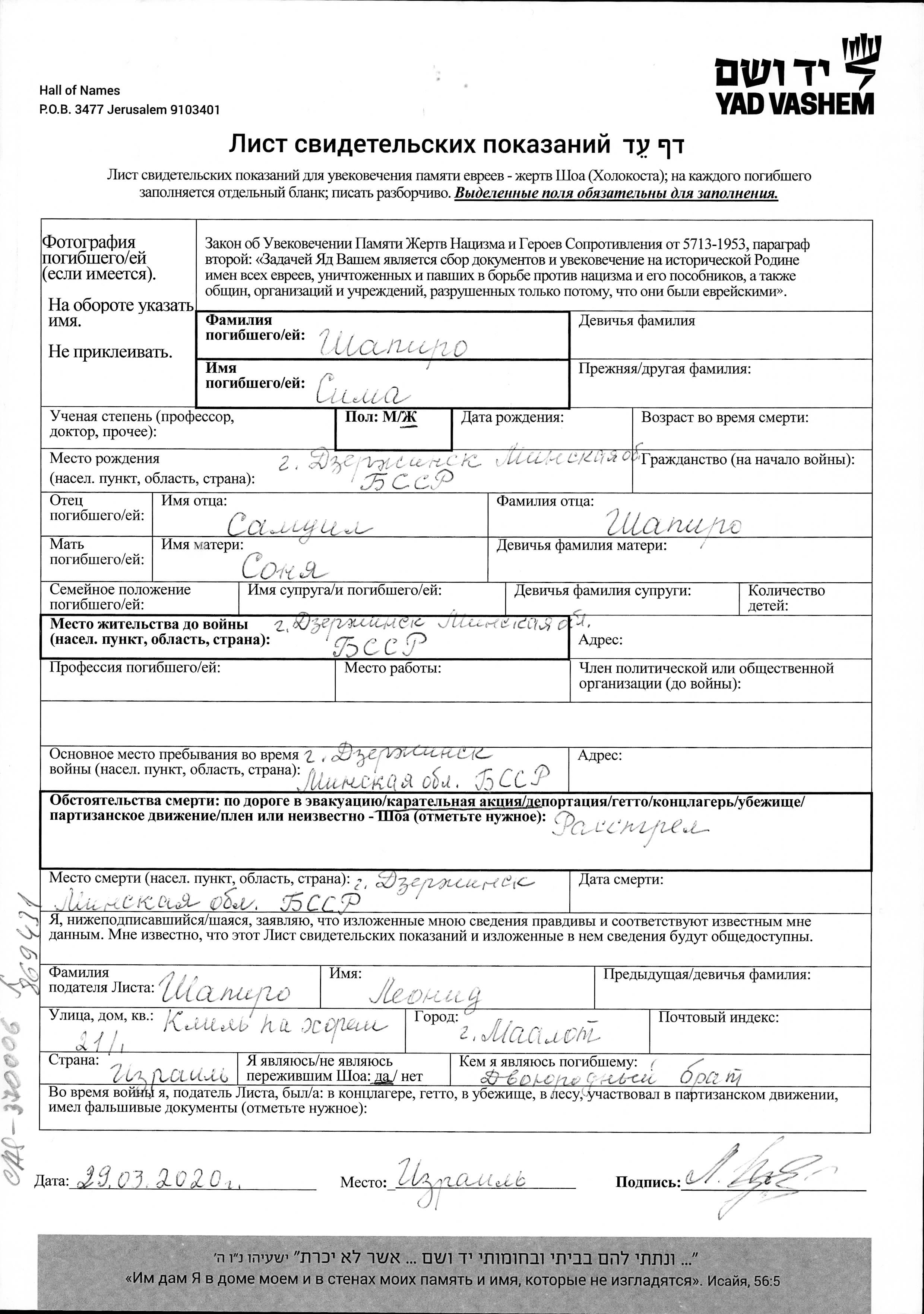 Sima Shapiro wurde in Dzerzhinsk, Weißrussland (UdSSR) geboren. Sie war Schüler/-in. Vor dem Zweiten Weltkrieg lebte sie in Dzerzhinsk, Weißrussland (UdSSR).