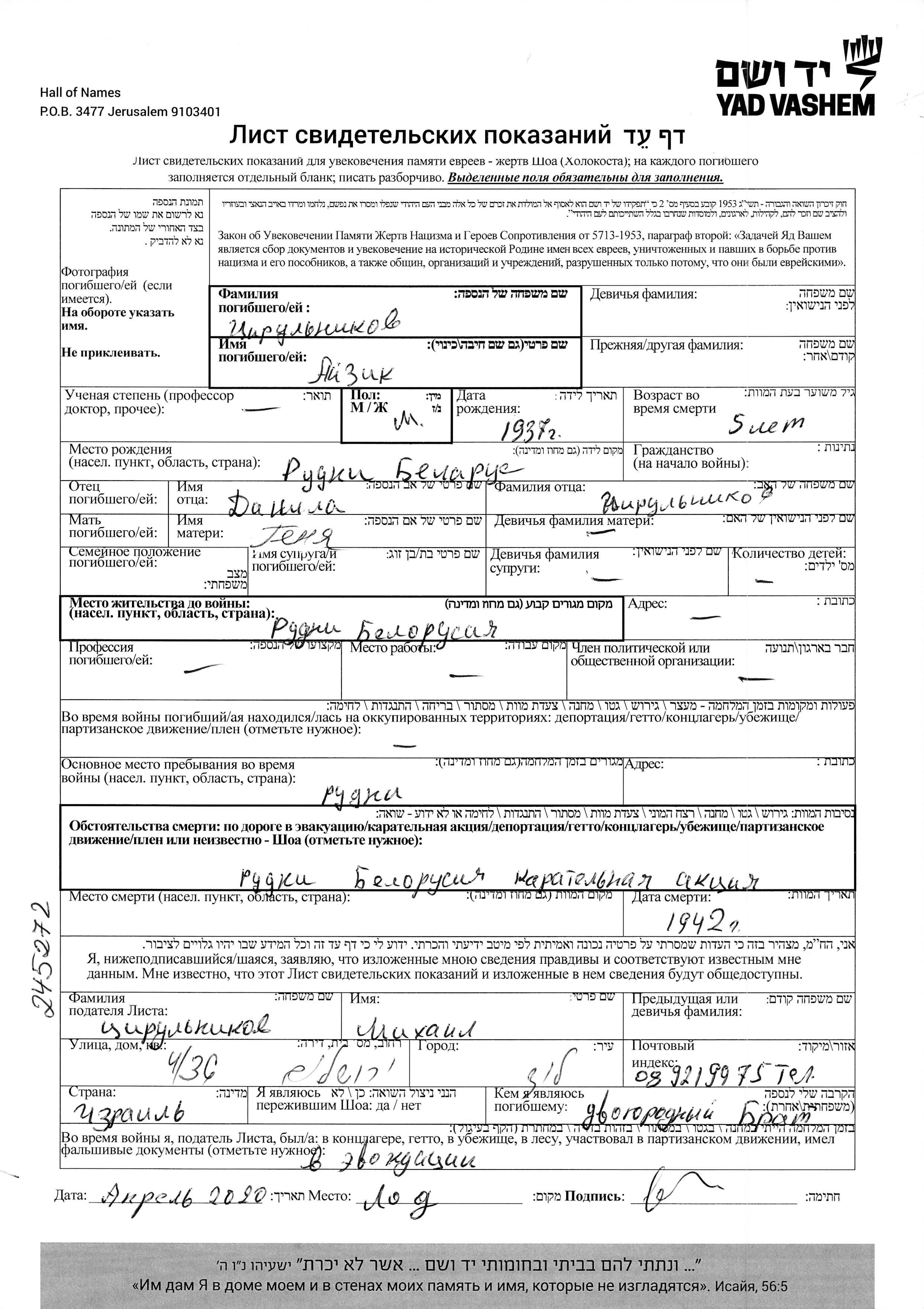 Tzirulnikov Ayzik 1937 Rudnya Teleshevskaya, Weißrussland (UdSSR) Gedenkblatt