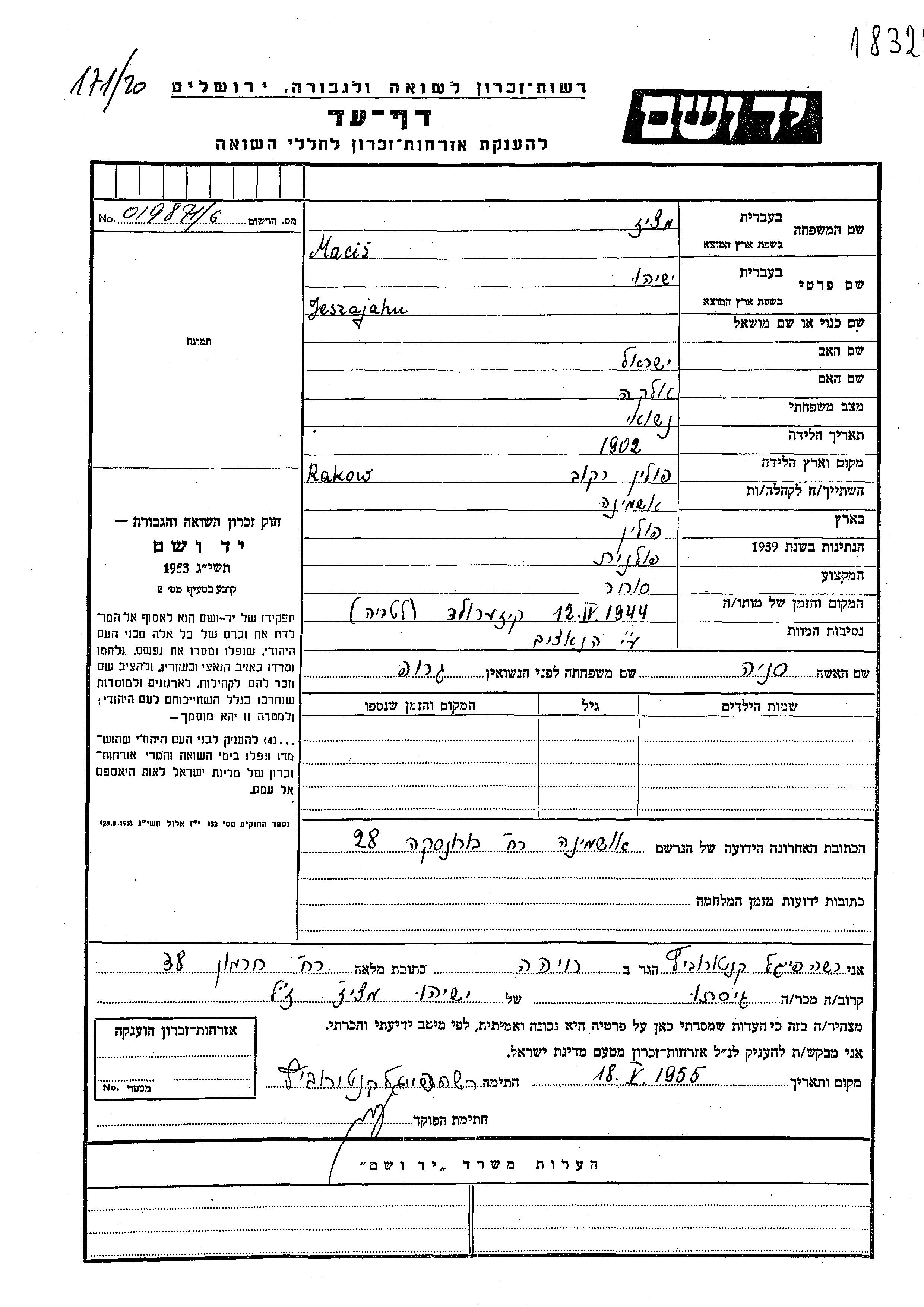 Jeszajahu Shiye Machiz wurde in unbekannter Ort geboren. Er war Kaufmann/-frau. Vor dem Zweiten Weltkrieg lebte er in Rakov, Polen.