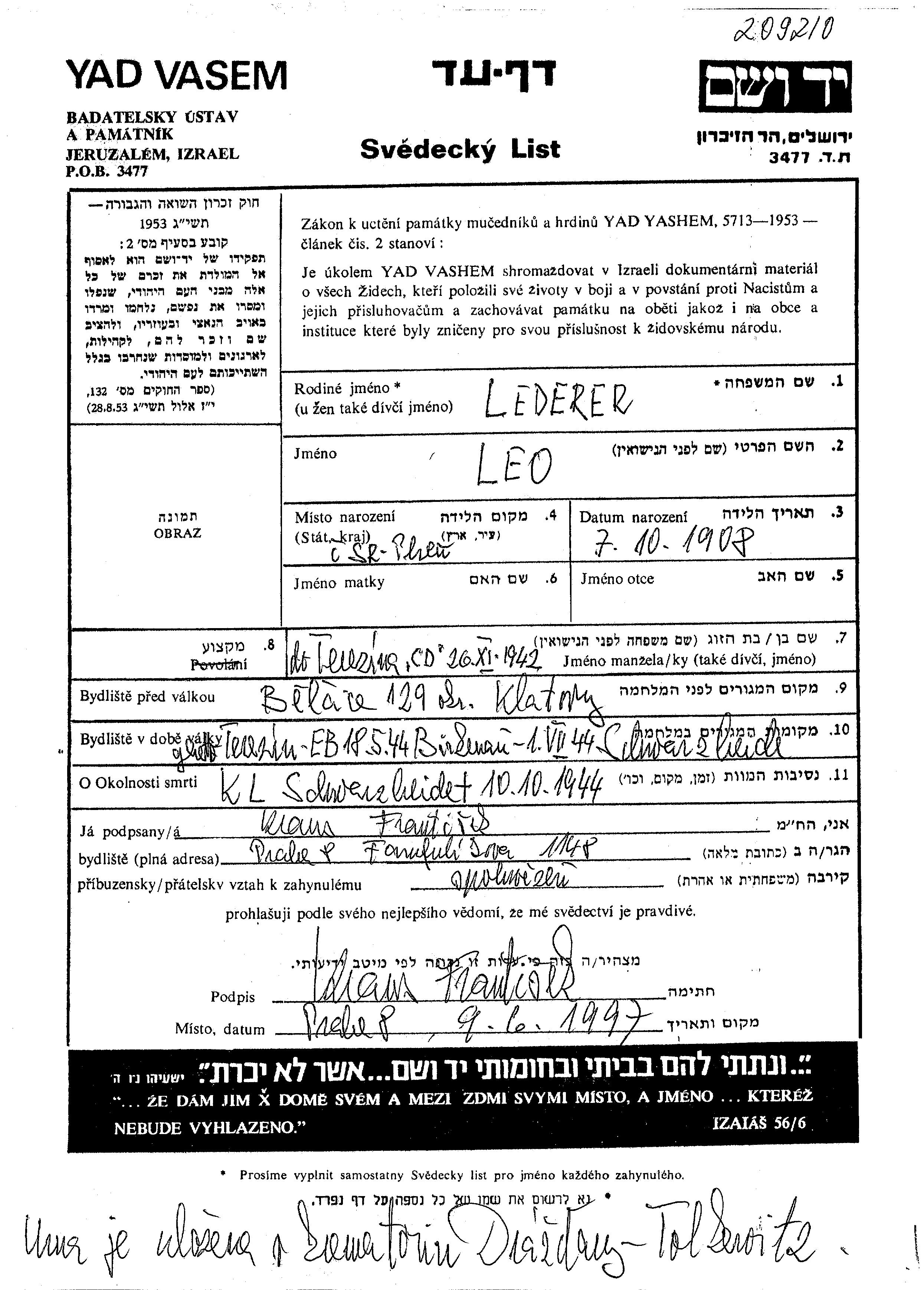Lederer | Leo | 1908 | Bělčice, Czechoslovakia | Gedenkblatt (digital, unterzeichnet) |