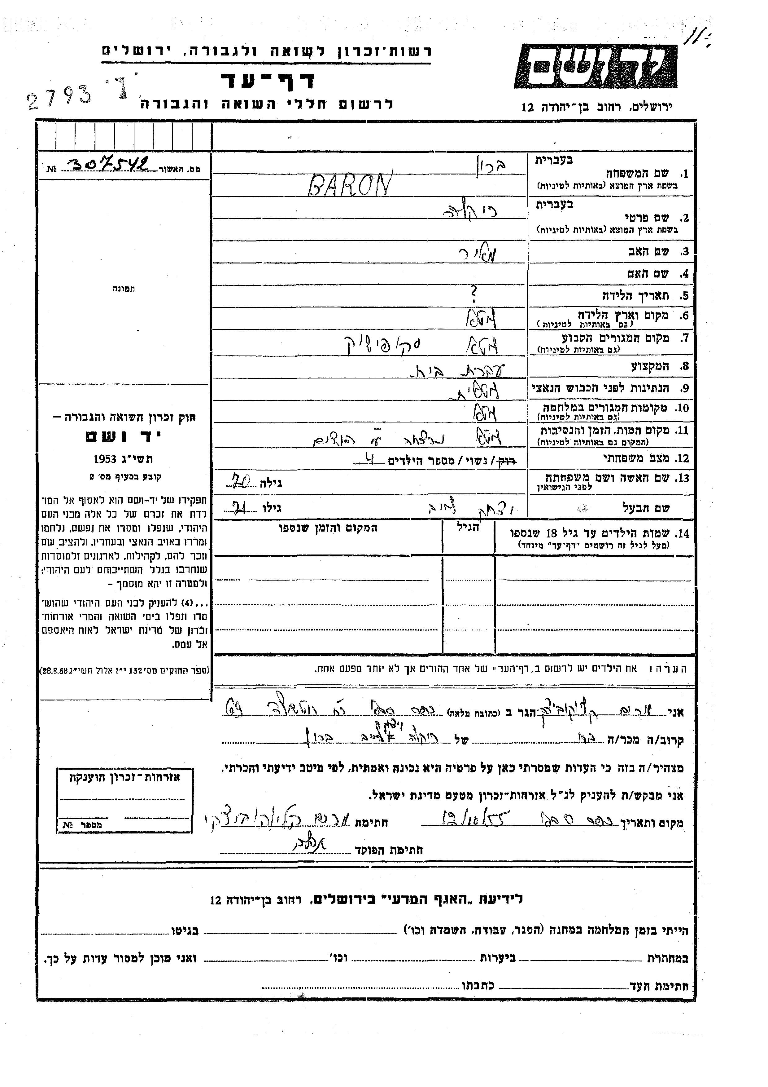 Rikla Baron wurde in Litauen geboren. Sie war die Tochter von Meir. Sie war Hausfrau und mit Yitzkhak Leib Verheiratet. Vor dem Zweiten Weltkrieg lebte sie in Skapiskis, Litauen. Während des Krieges war sie in Litauen.