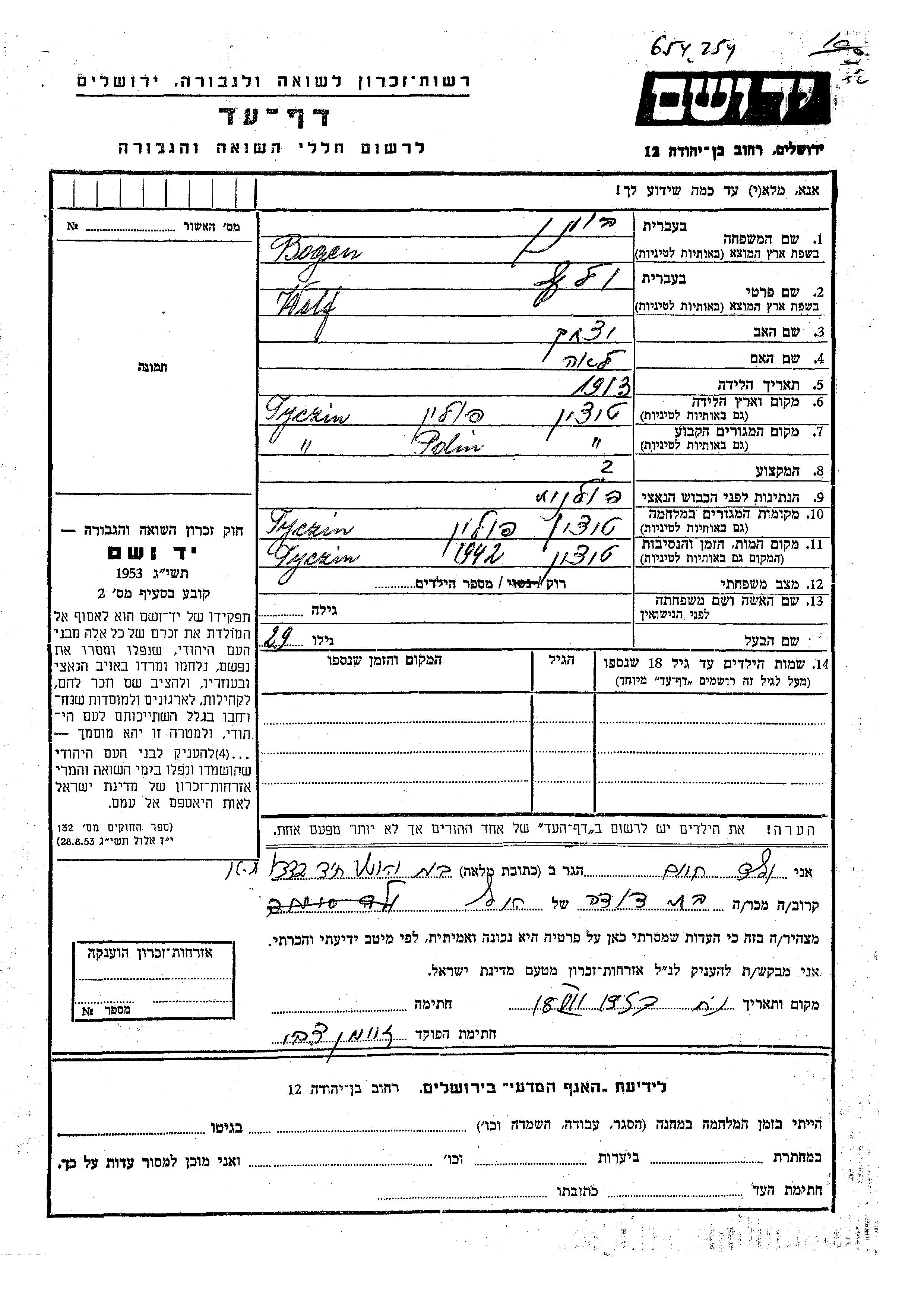 Wolf Bogen wurde im Jahr 1913 in Tyczin, Polen geboren. Er war der Sohn von Yitzkhak und Lea. Er war Ledig. Vor dem Zweiten Weltkrieg lebte er in Tyczin, Polen. Während des Krieges war er in Tyczin, Polen.
