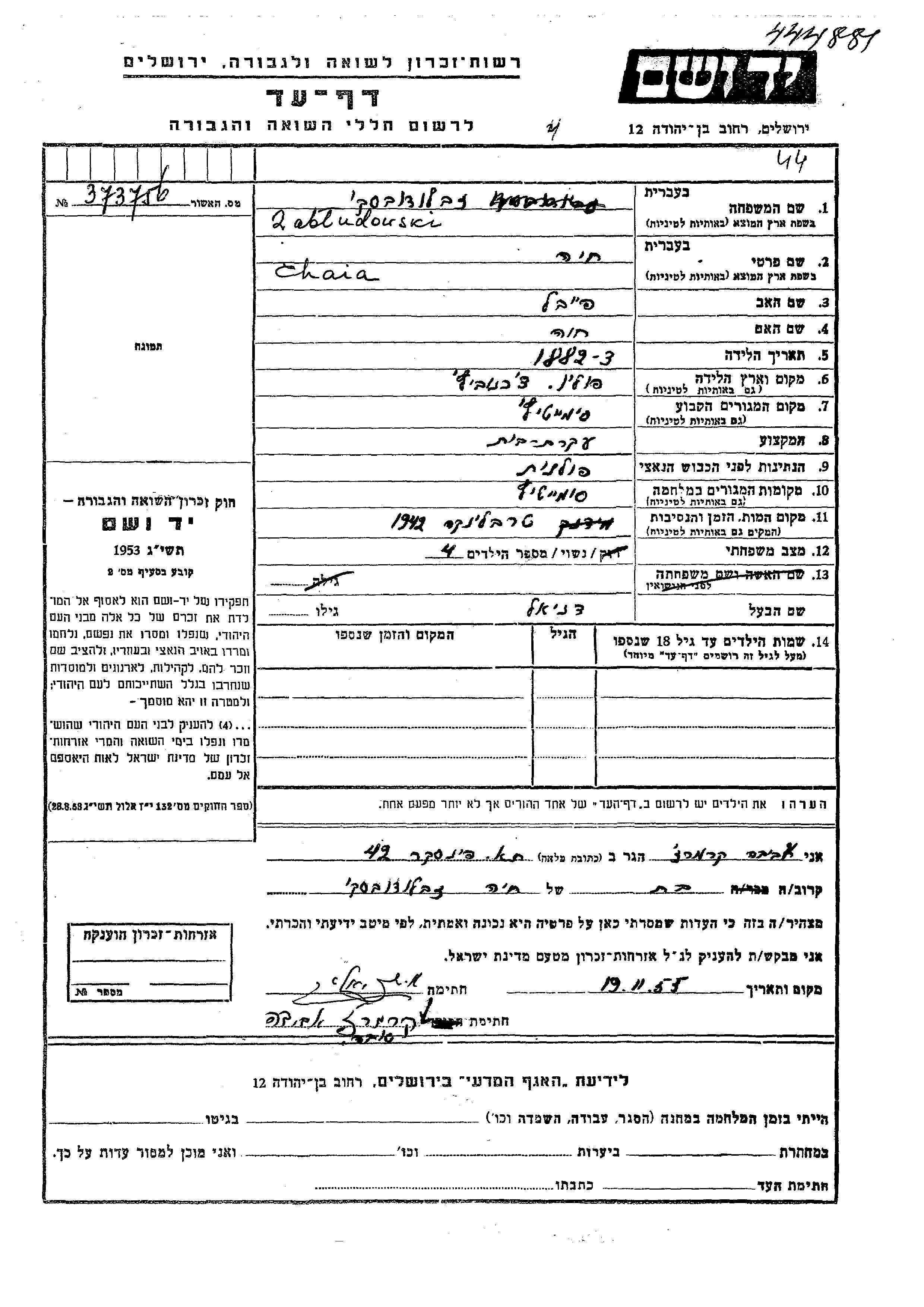 Chaia Feiga Zabludovski wurde im Jahr 1882 in Siemiatycze, Polen geboren. Sie war Hausfrau. Vor dem Zweiten Weltkrieg lebte sie in Siemiatycze, Polen.