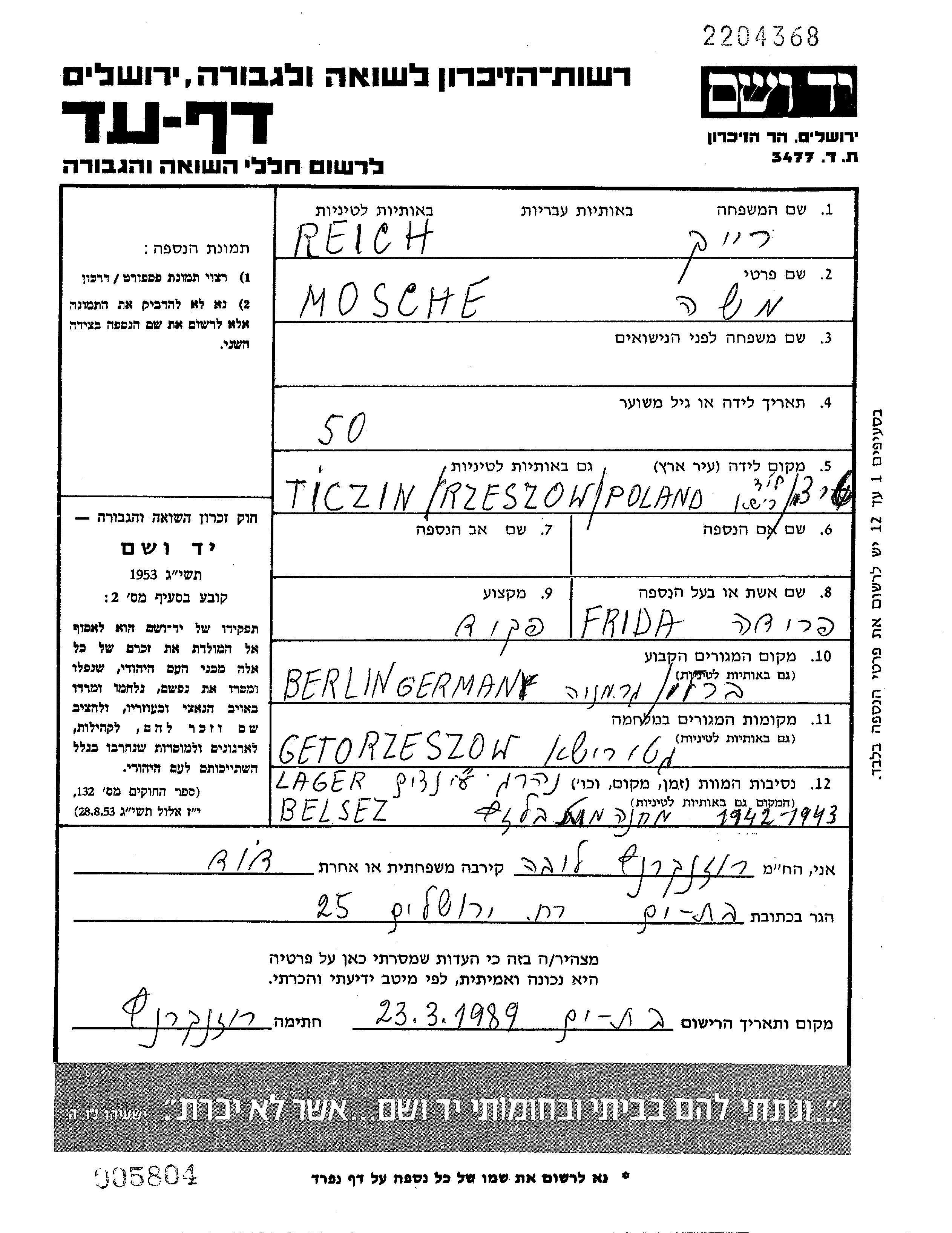Reikh | Moshe | 1895 | Berlin, Deutsches Reich | Gedenkblatt |