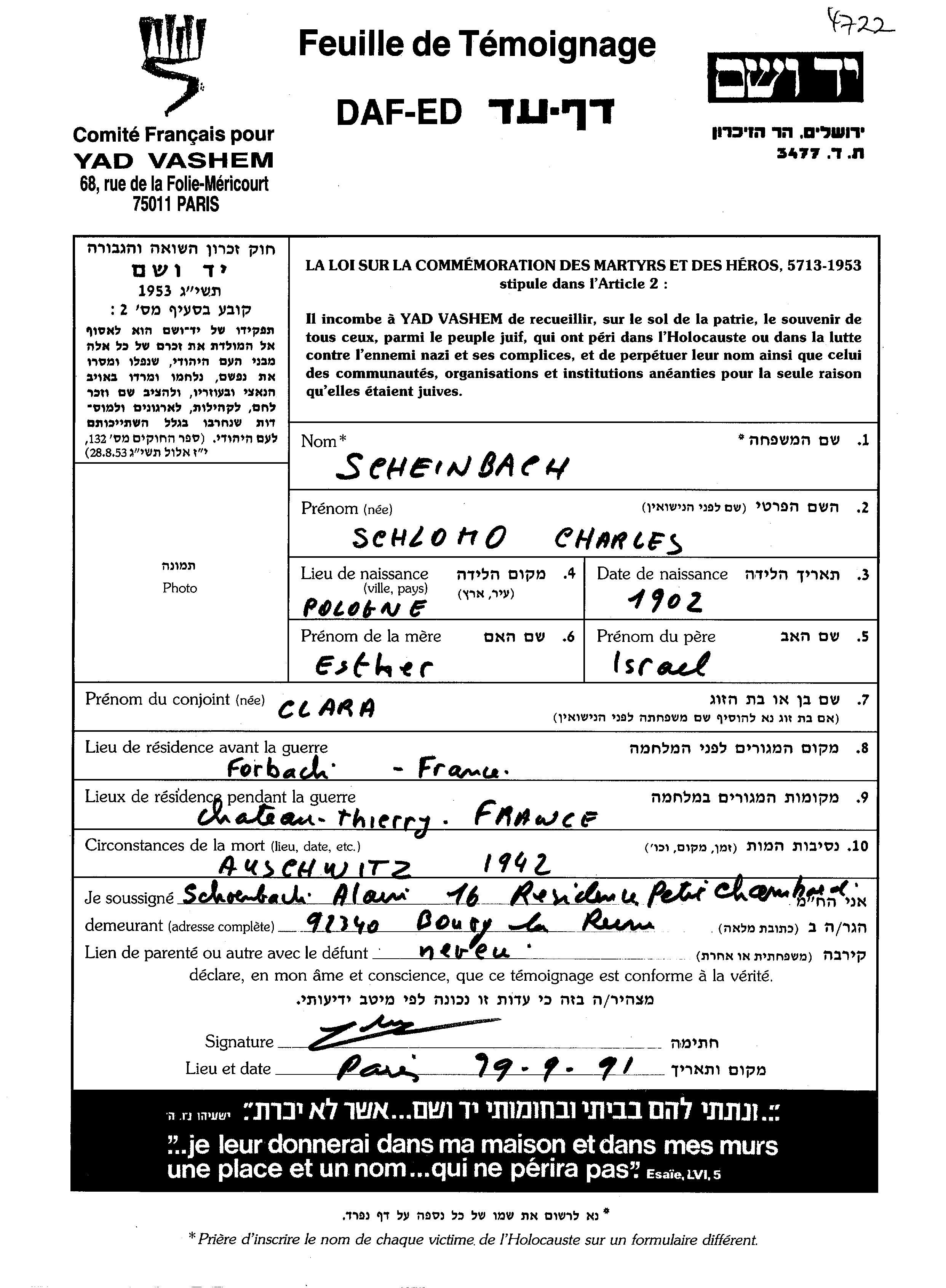 Scheinbach Schlomo Charles 1902 Forbach, Frankreich Gedenkblatt