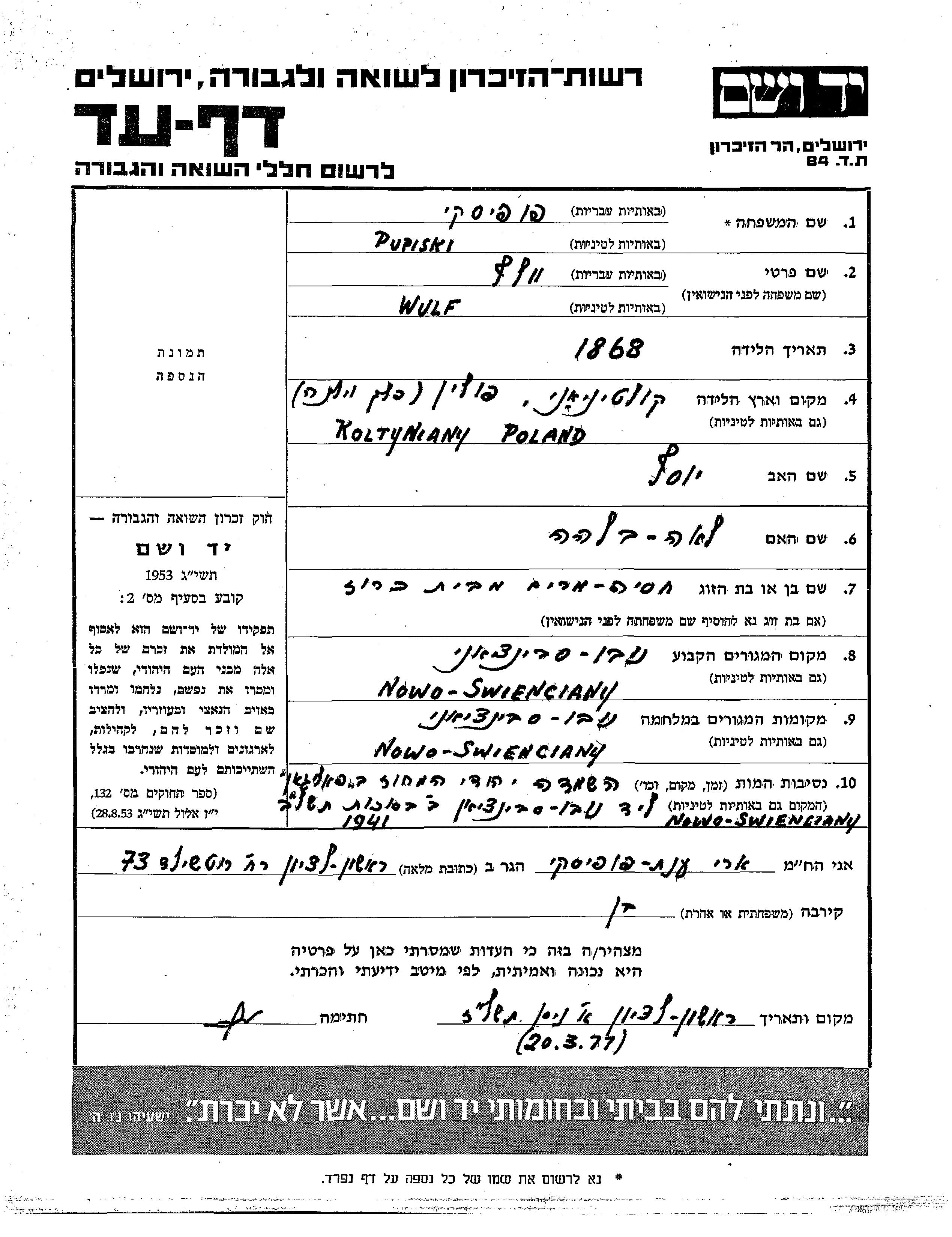 Wulf Popiski wurde im Jahr 1868 in Koltyniany, Polen geboren. Er war der Sohn von Yosef und Lea Bilha. Vor dem Zweiten Weltkrieg lebte er in Nowo Swieciany, Polen. Während des Krieges war er in Nowo Swieciany, Polen.