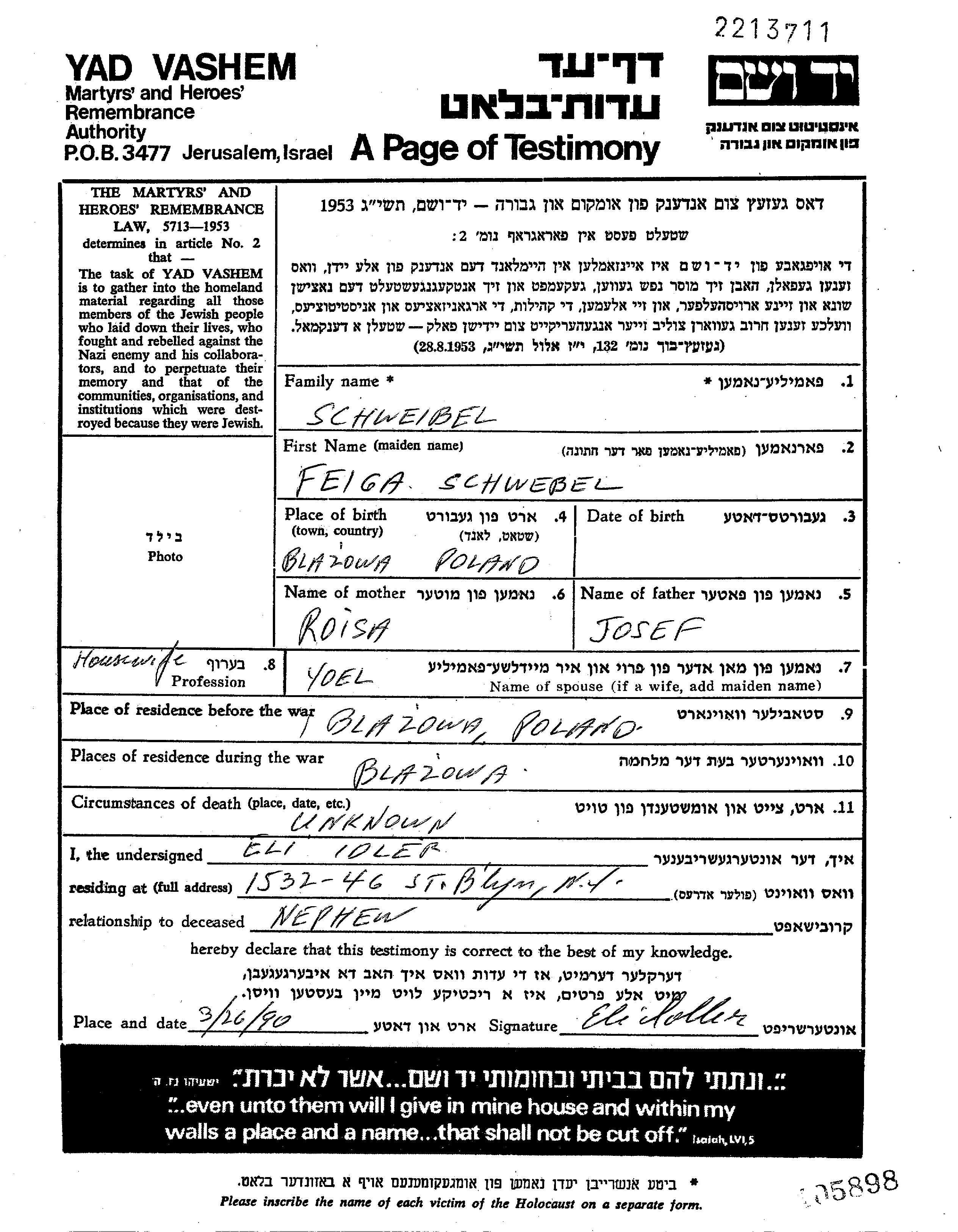 Fanny Feiga Shvebel, geb. Avraham wurde im Jahr 1886 in Polen geboren. Sie war Hausfrau. Vor dem Zweiten Weltkrieg lebte sie in Blazowa, Polen.