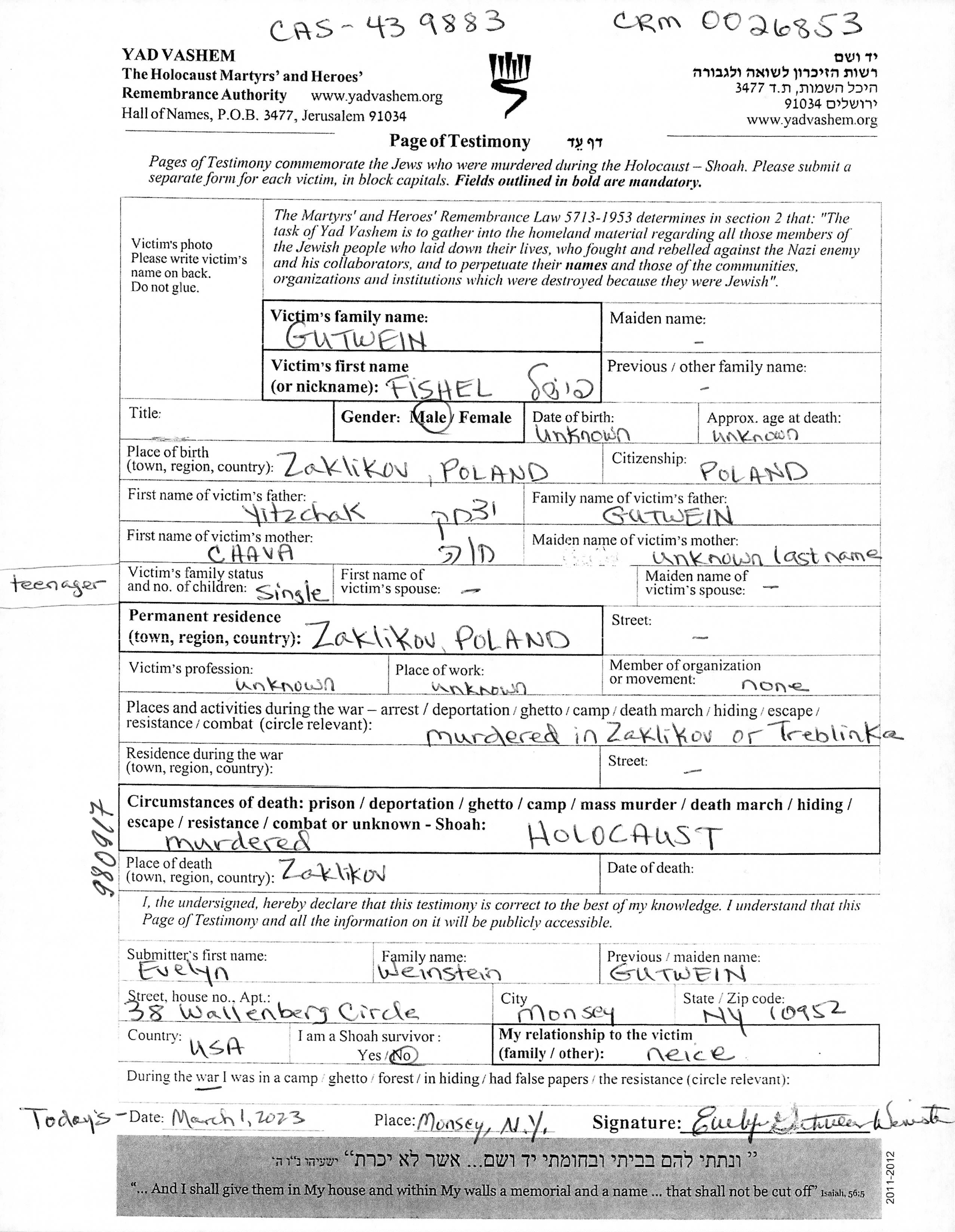 Fishel Gutwein wurde in Zaklikow, Polen geboren. Er war der Sohn von Yitzchak und Chava. Er war Kind. Vor dem Zweiten Weltkrieg lebte er in Zaklikow, Polen. Während des Krieges war er in Zaklikow, Polen.