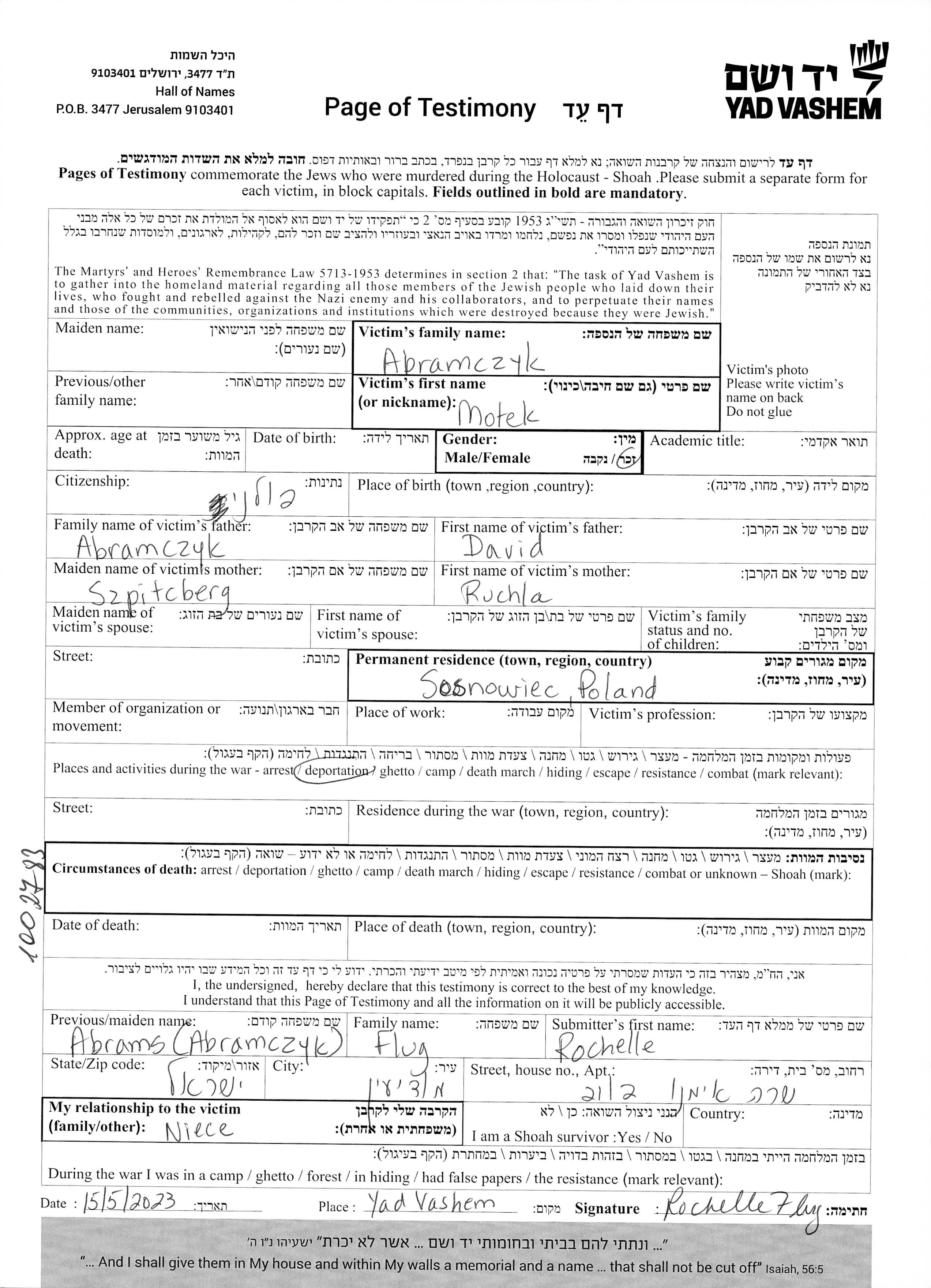Motek Abramczyk wurde Er war der Sohn von David und Ruchla, geb. Szpitcberg. Vor dem Zweiten Weltkrieg lebte er in Sosnowiec, Polen.