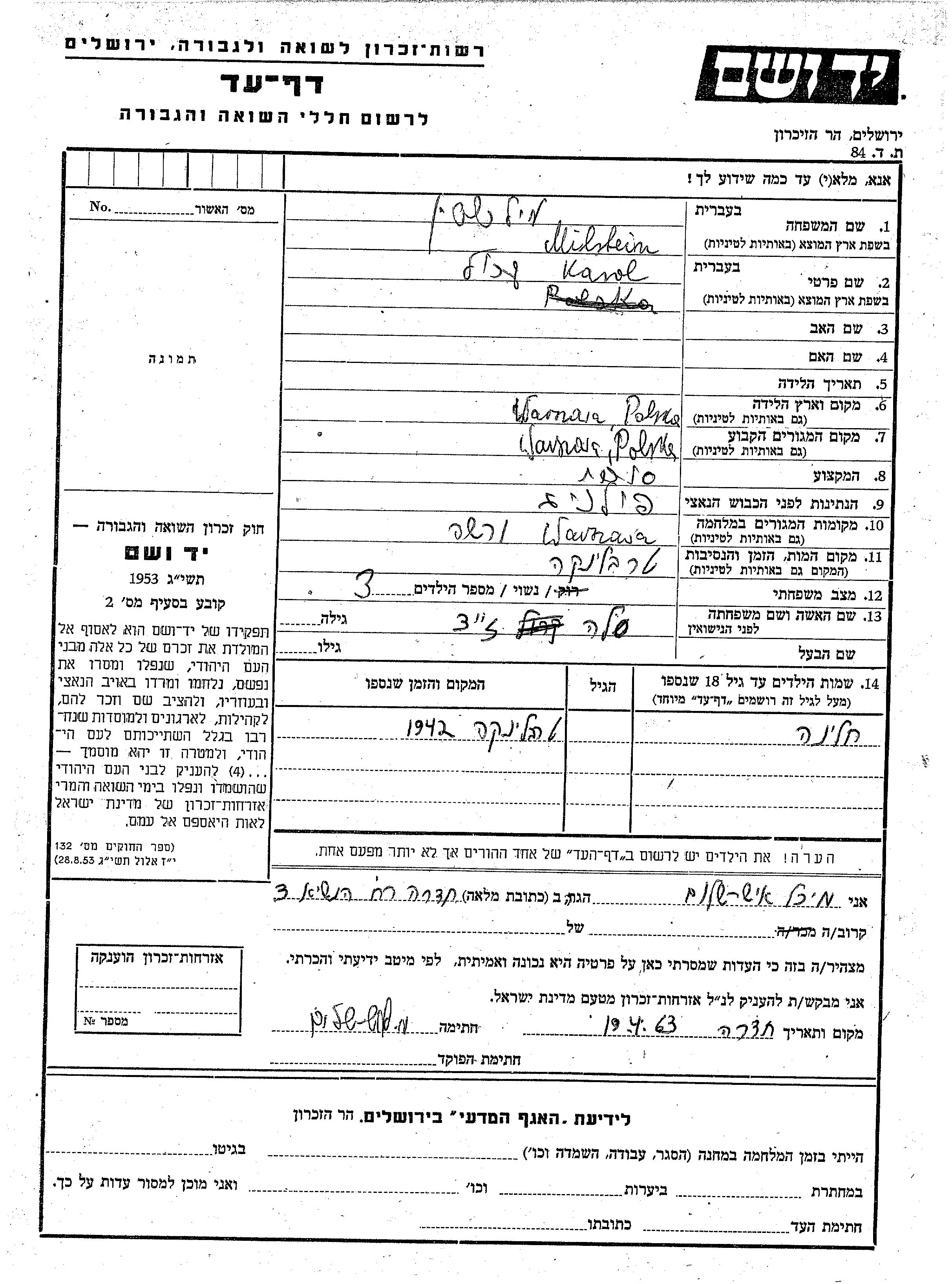 Karol Milstein wurde in Varsha, Polen geboren. Er war Kaufmann/-frau und mit Sala, geb. Zeid Verheiratet. Vor dem Zweiten Weltkrieg lebte er in Varsha, Polen. Während des Krieges war er in Varsha, Polen.
