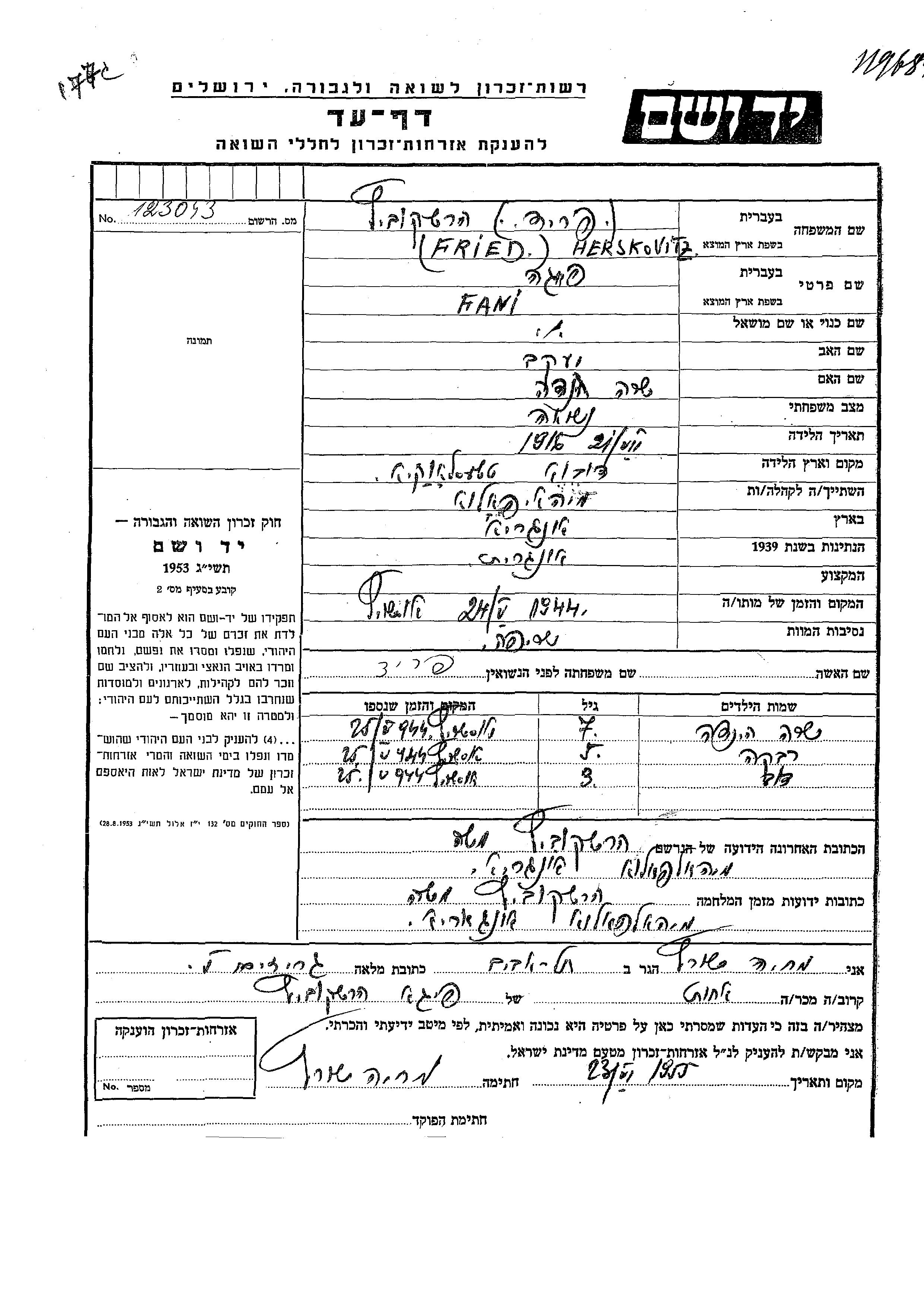 Fani Faige Herskovitz, geb. Fried wurde im Jahr 1915 in Satu Mare, Rumänien geboren. Sie war Hausfrau. Vor dem Zweiten Weltkrieg lebte sie in Mihalyfalva.