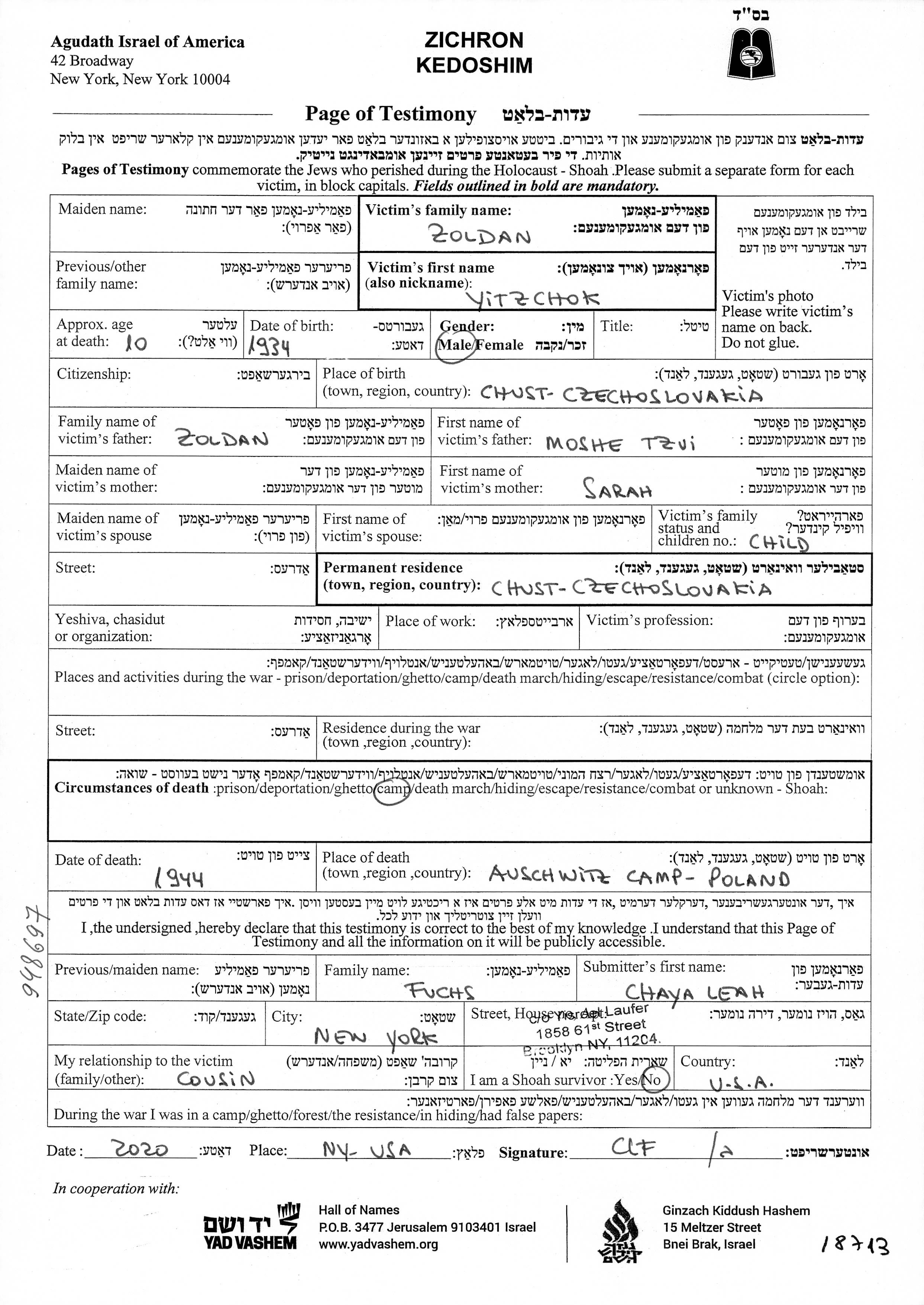 | Zoldan | Yitzchok | 1934 | Chust, Tschechoslowakei | Gedenkblatt |